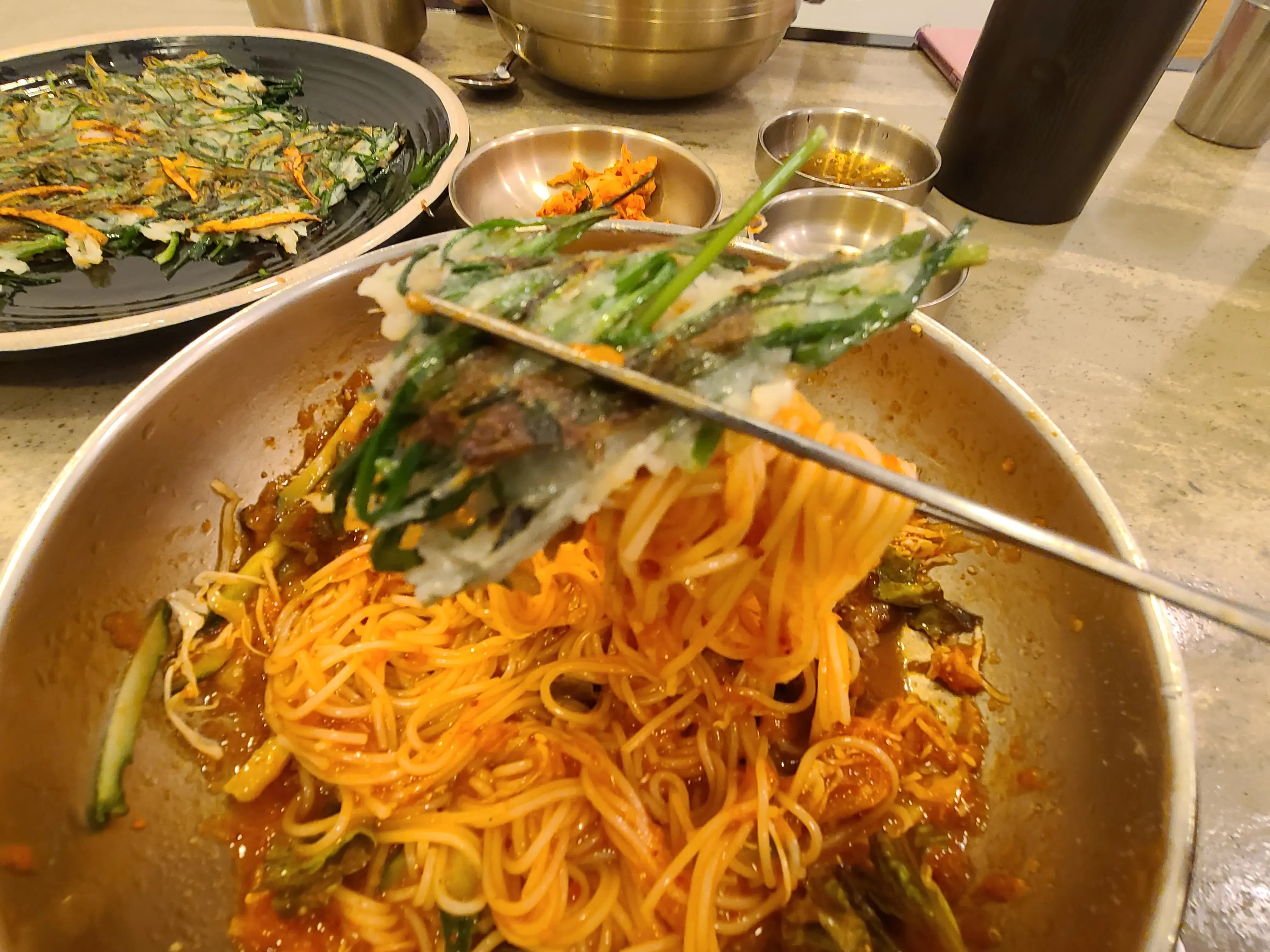 부추전과 함께 먹는 비빔국수도 맛있다