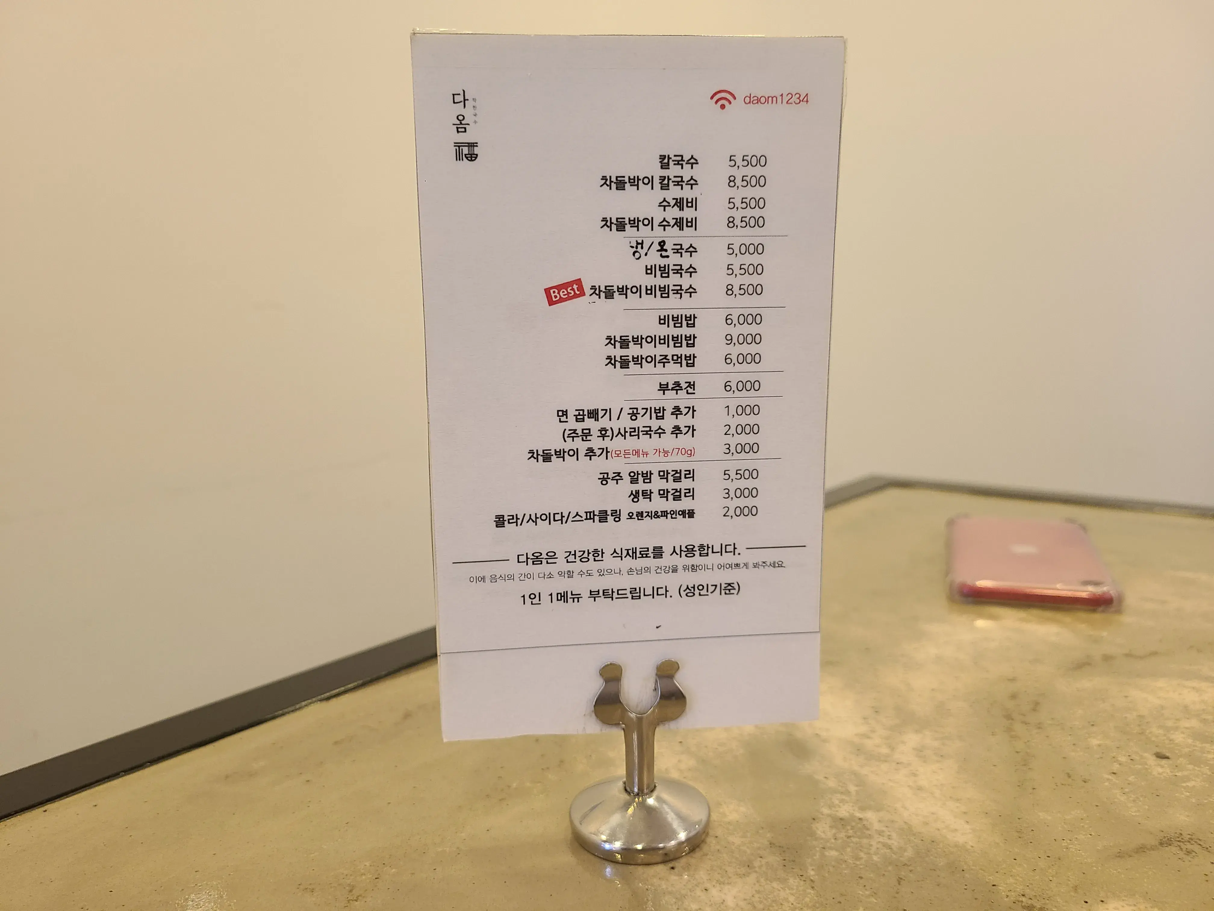 국수, 수제비, 비빔밥들로 구성된 메뉴