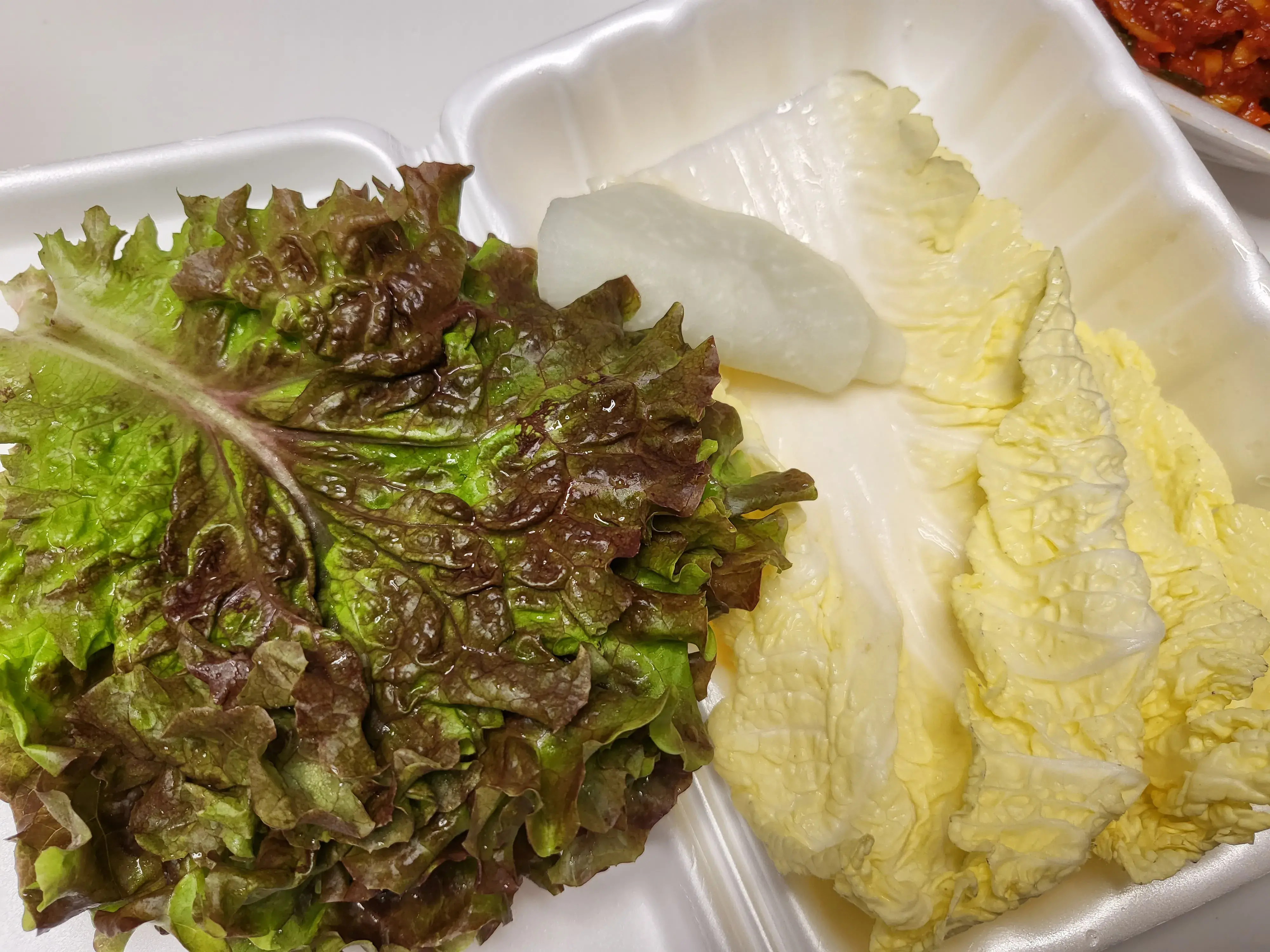 쌈야채 위에 고기를 한 점 그리고 매운 김치까지