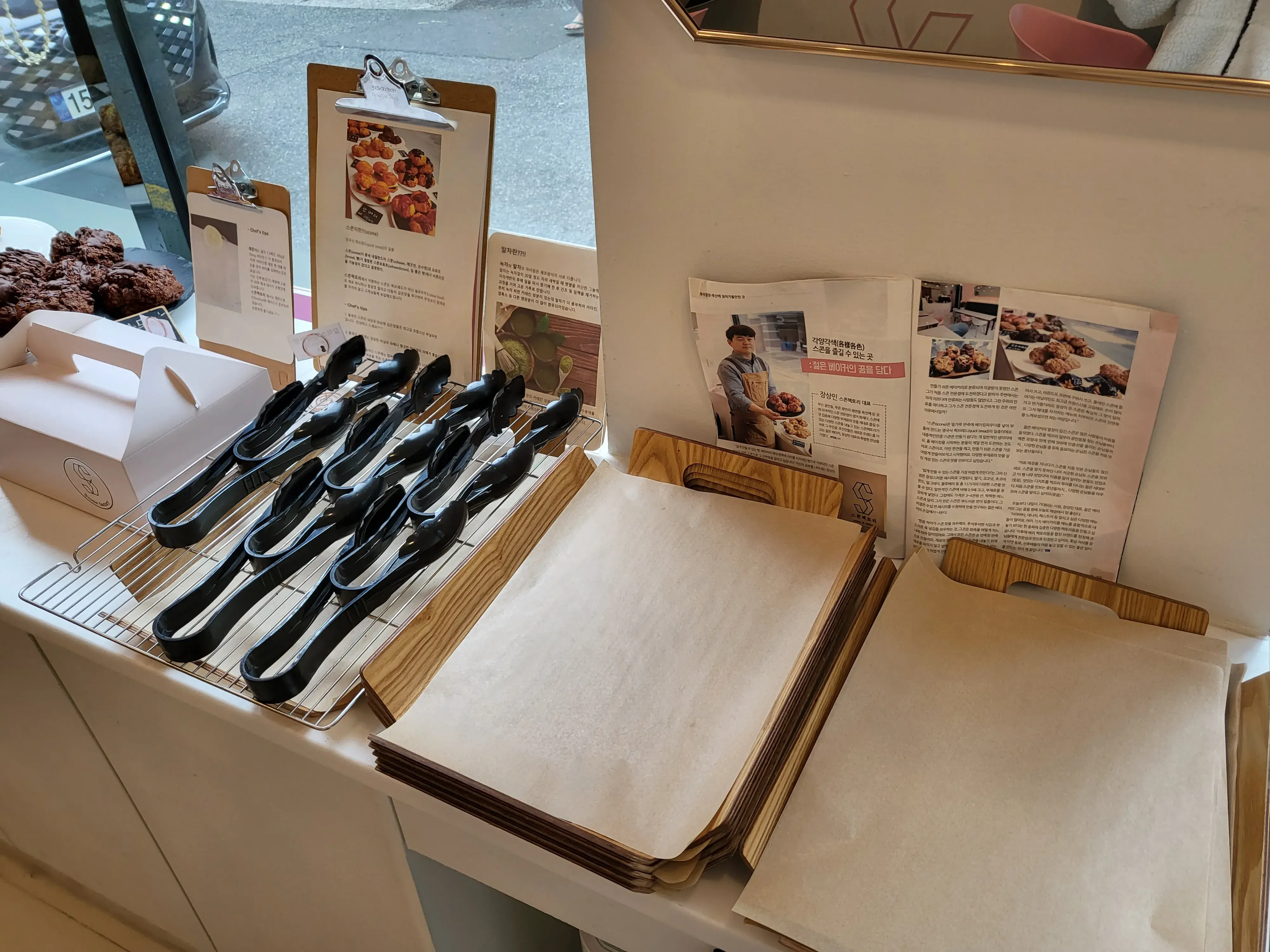 스콘을 집을 수 있는 집게와 트레이가 보인다