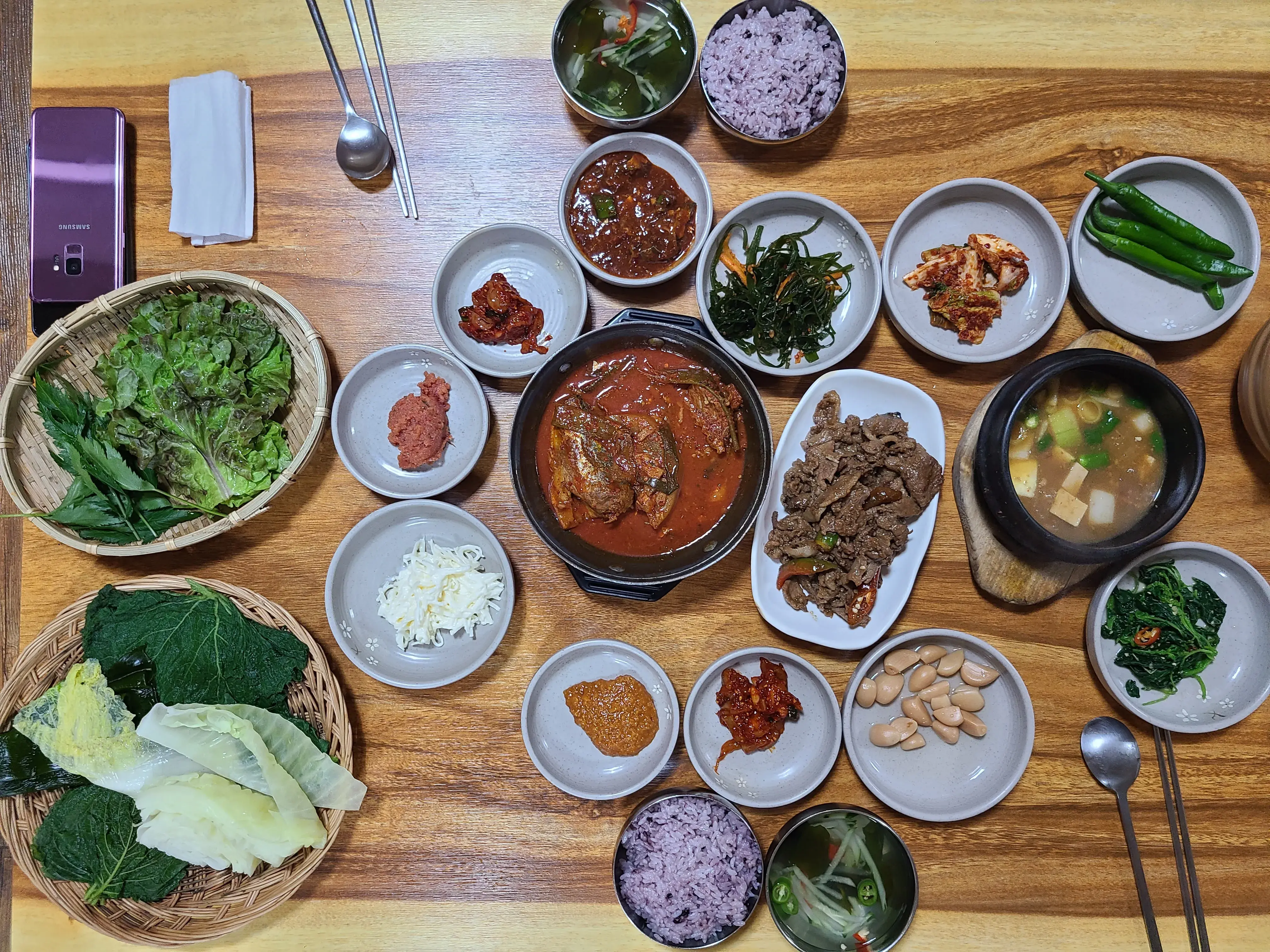쌈 채소와 젓갈 그리고 각종 반찬들