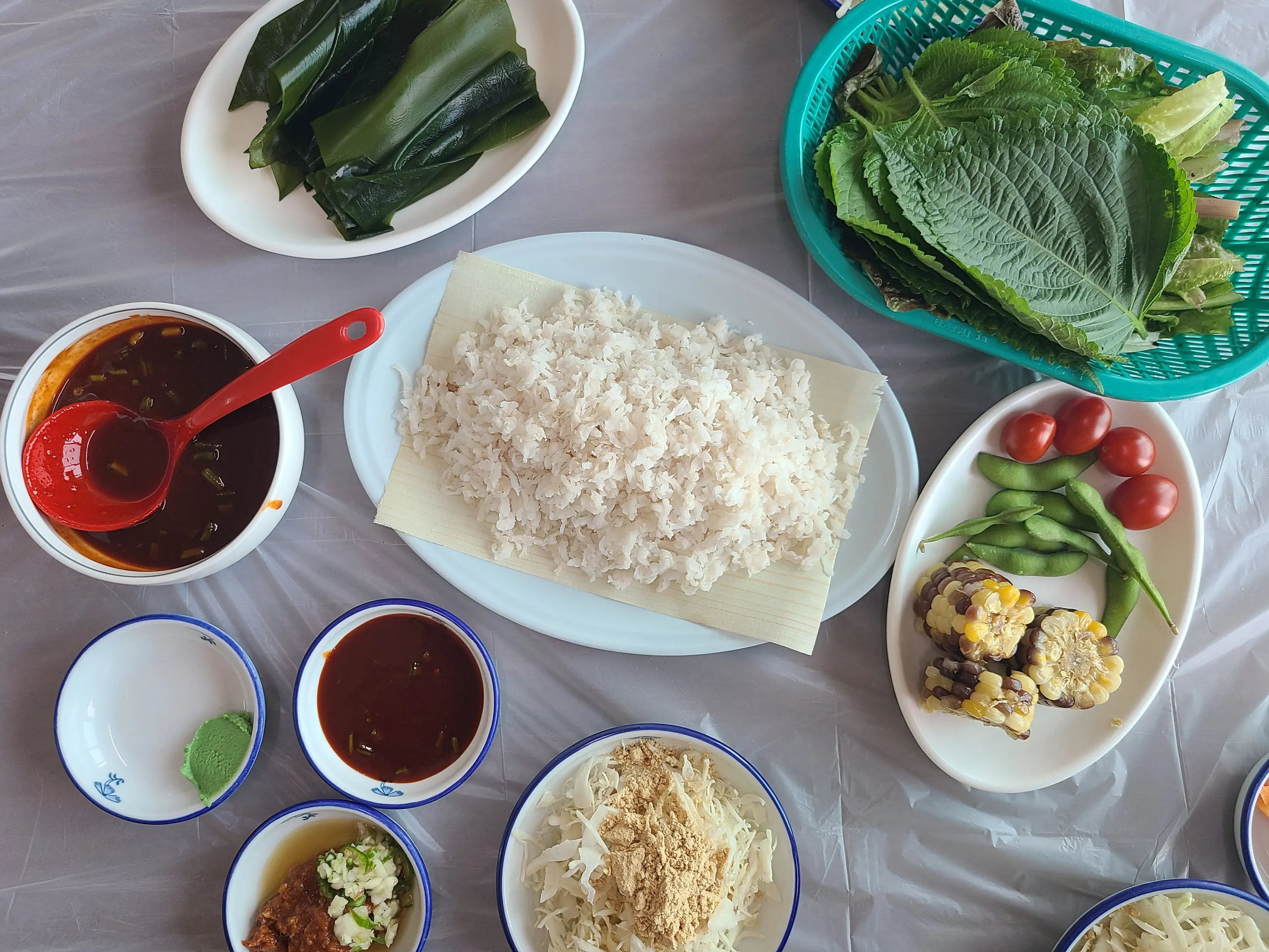 쌈야채, 다시마, 콩가루가 올려진 양배추 채,