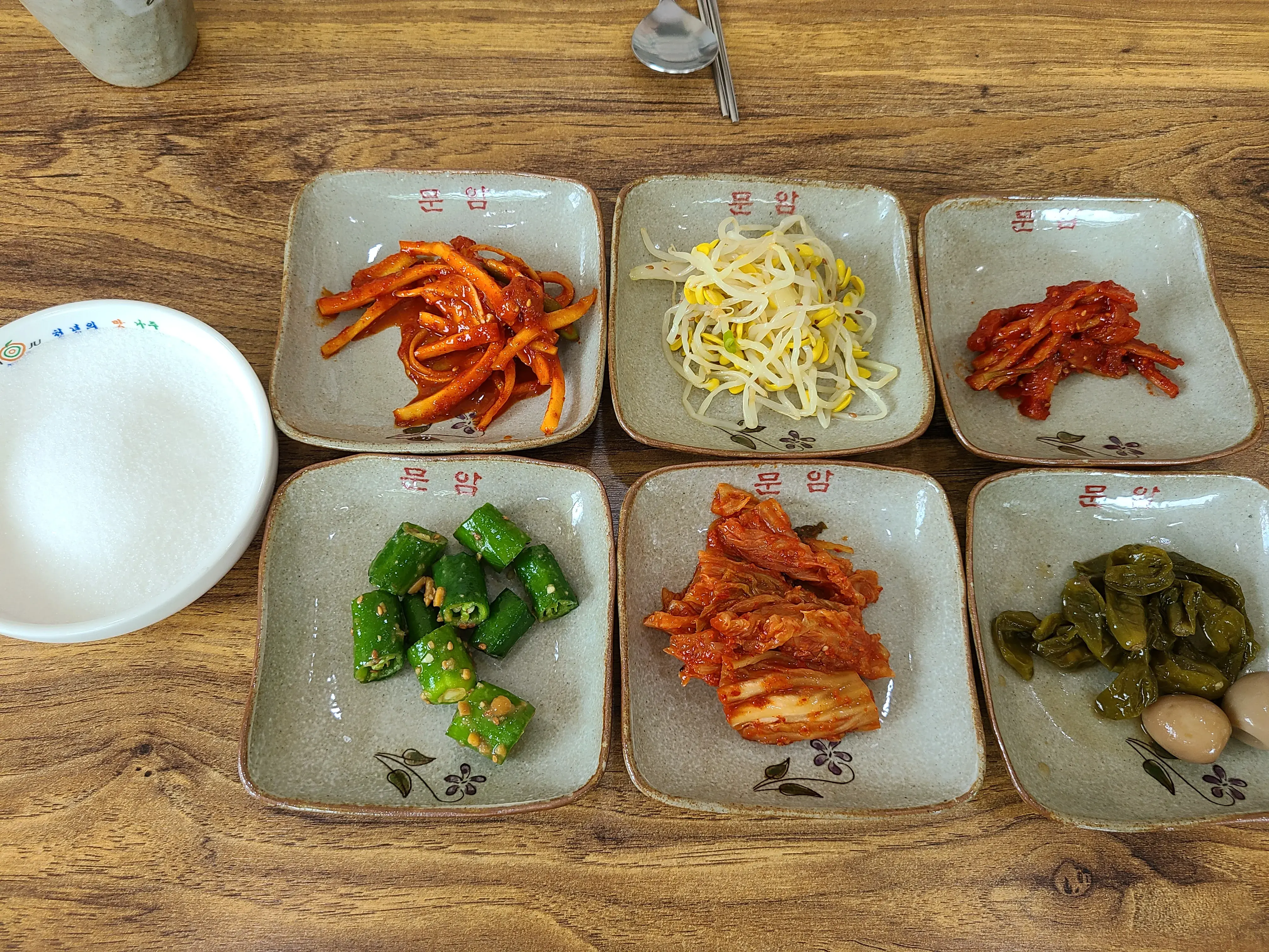 밑반찬이 먼저 나오면서 설탕이 같이 나온다
