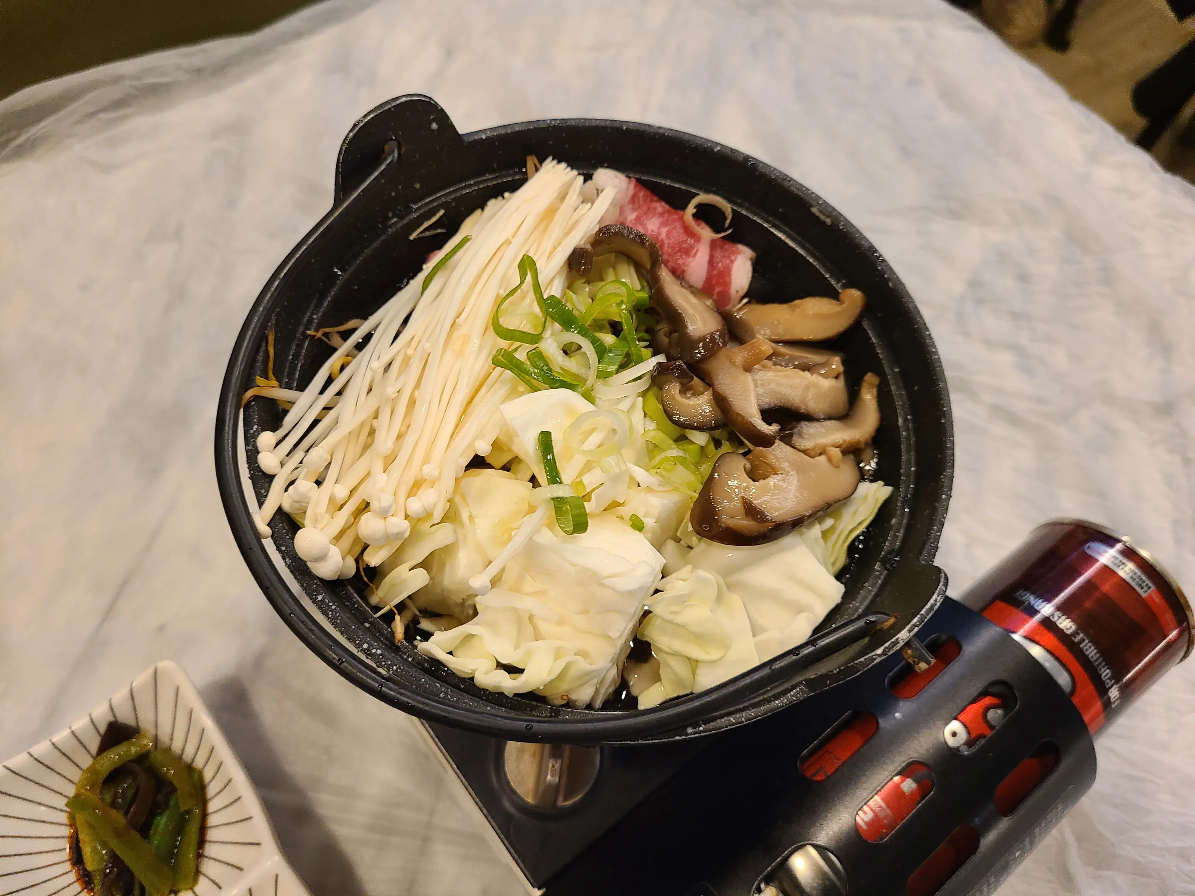 기본 상차림과 함께 샤브샤브 전골이 나오는데
