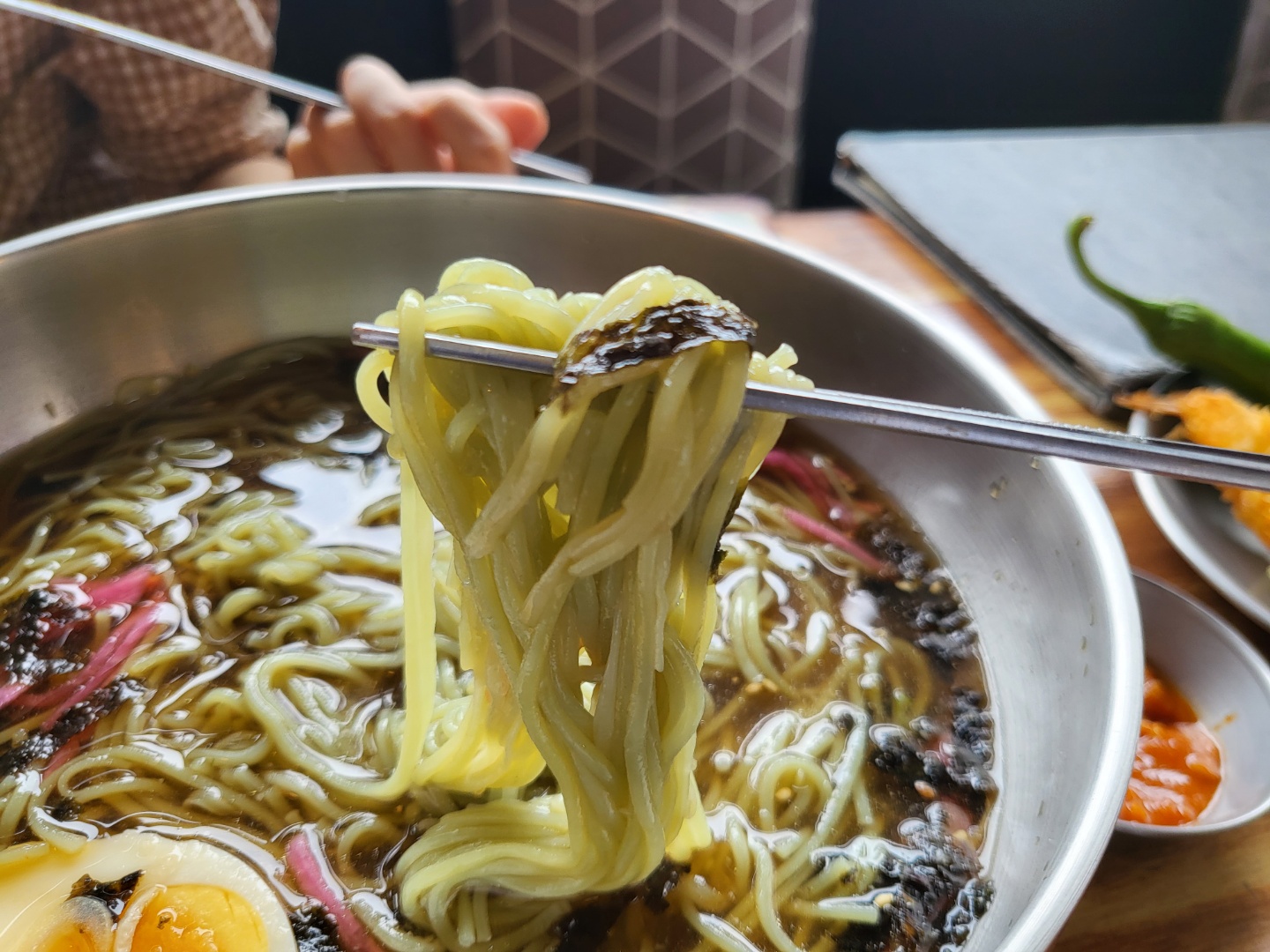 다른 점은 면! 역시 부추가 들어간 초록색 면
