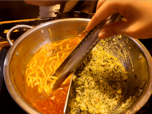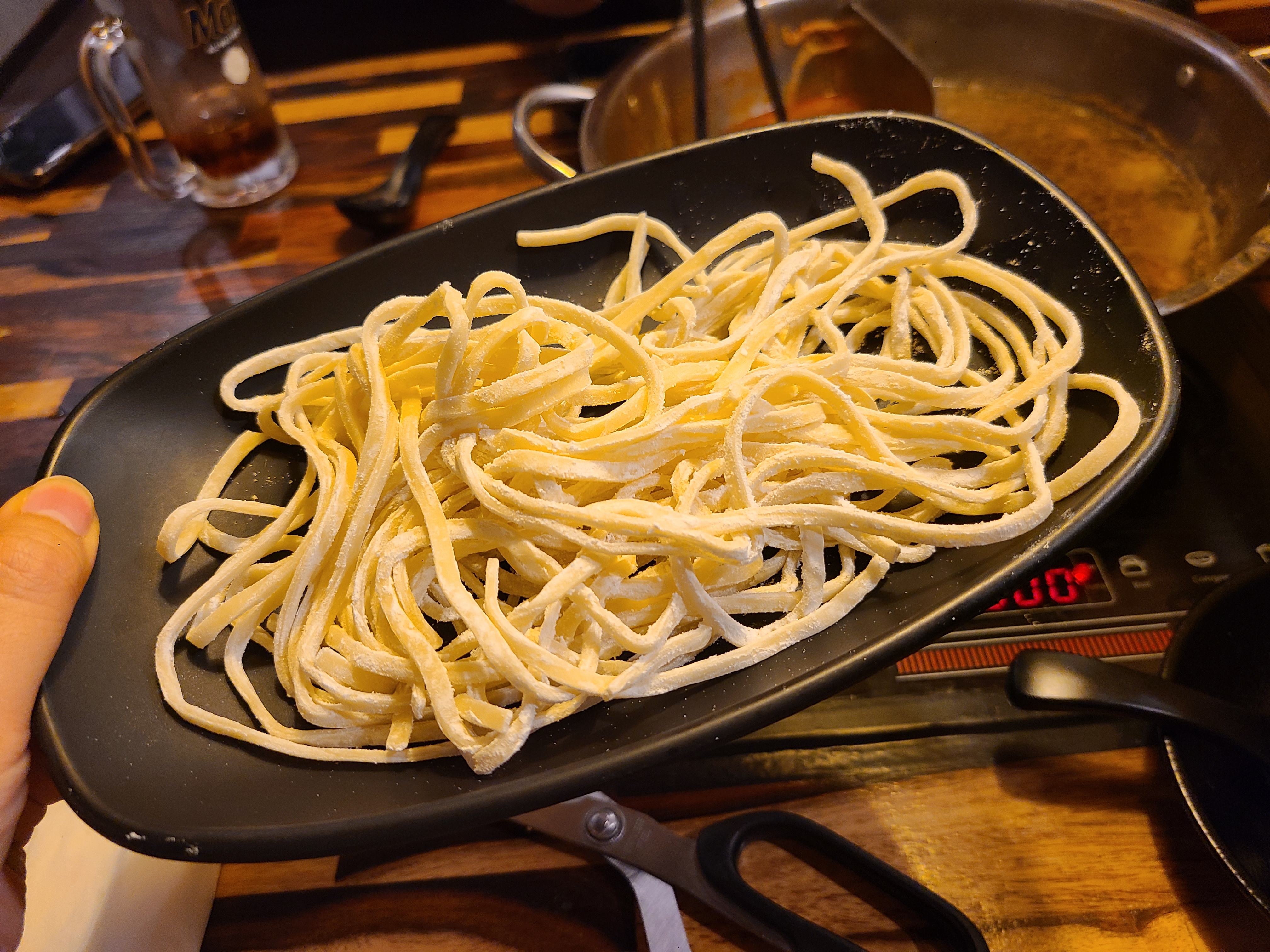 우리는 카라이(얼큰) 육수에 칼국수를 넣었고