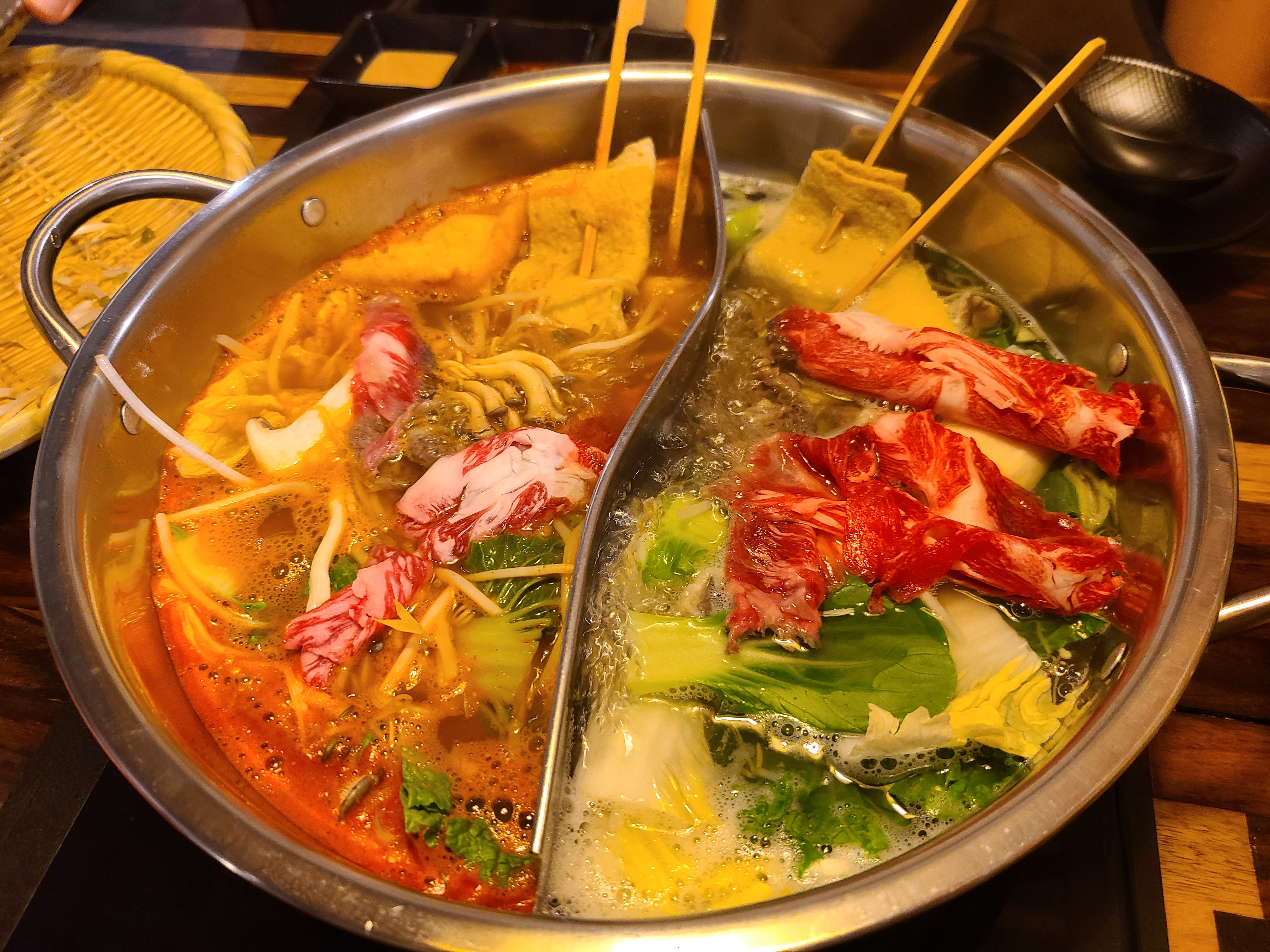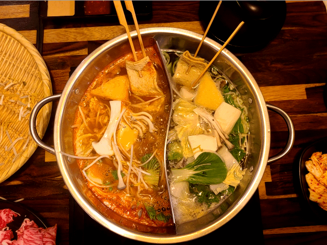 2가지 맛 육수와 각종 야채 및 버섯