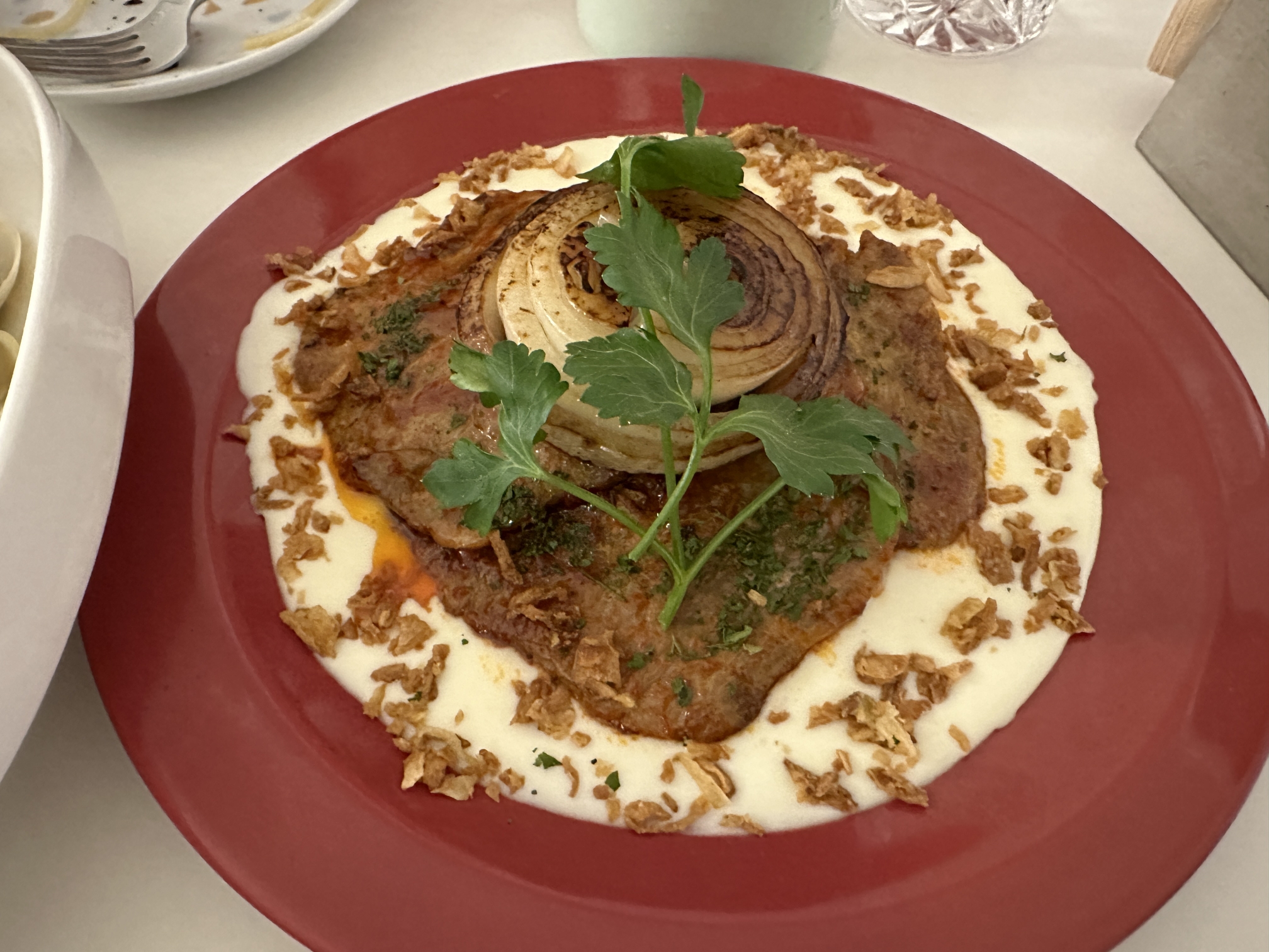 양파, 고기, 감자퓌레를 한입에 먹으면