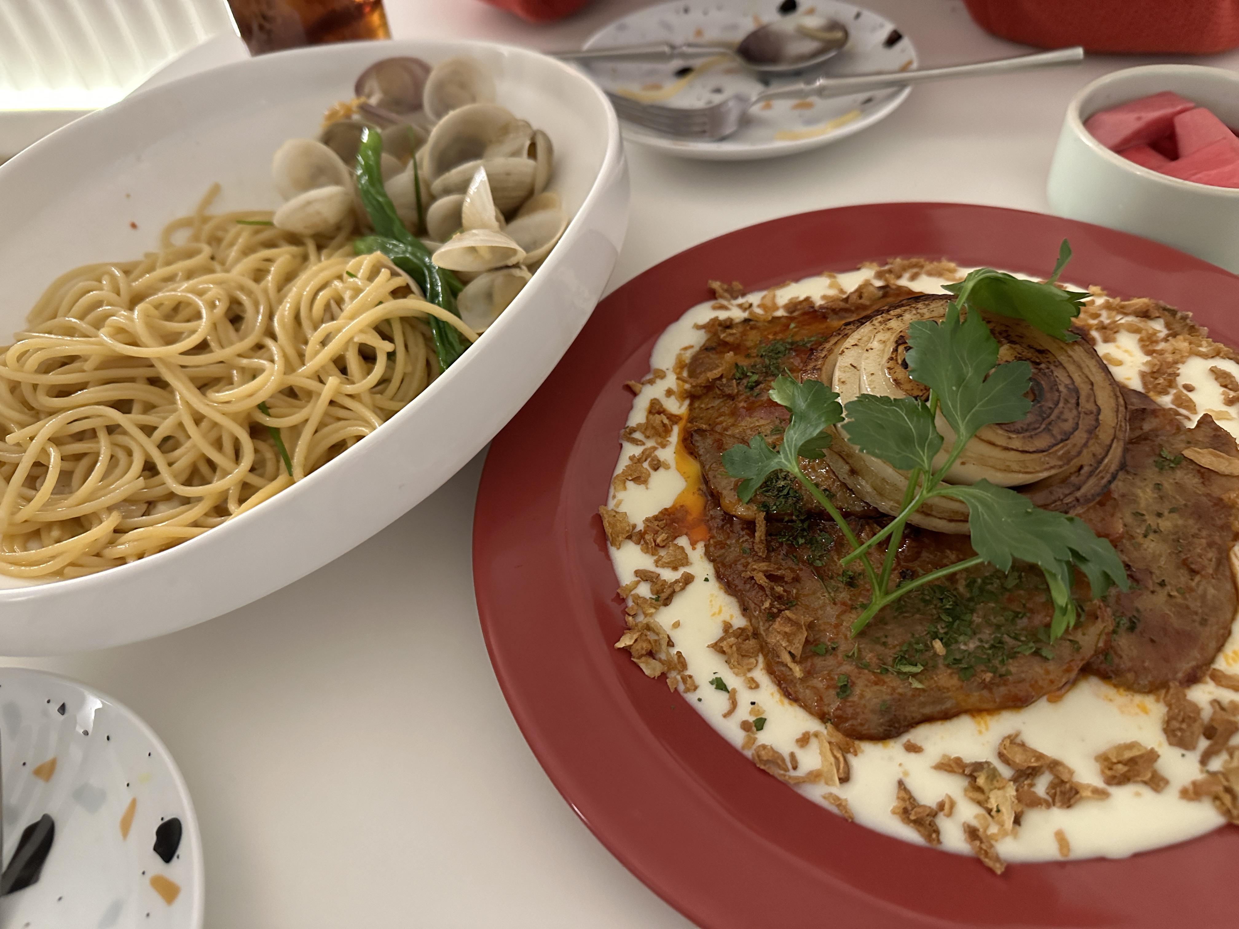 양념이 맛있게 잘 배어있는 조개와 면의 조화