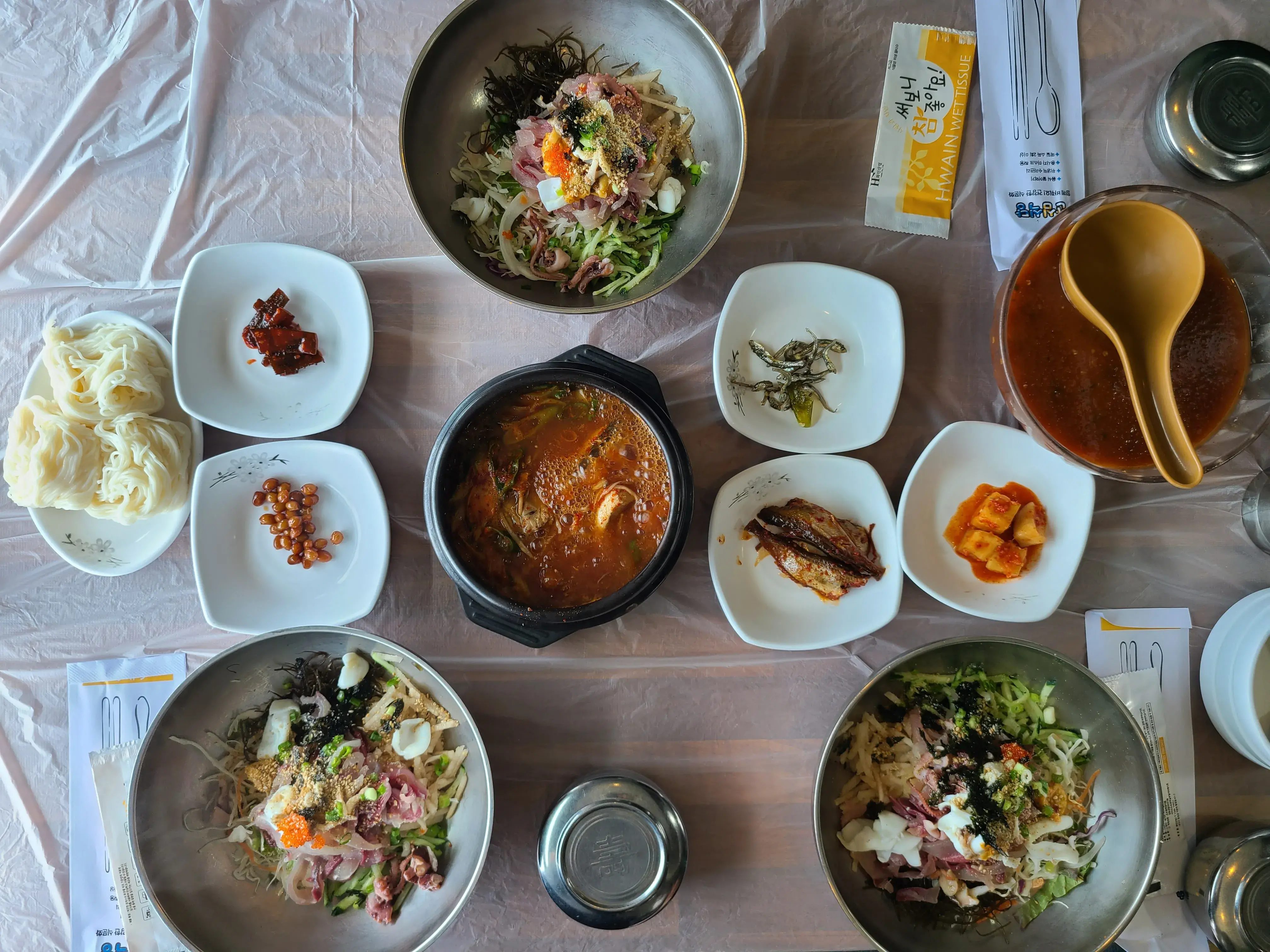 물회, 매운탕, 공기밥 그리고 소면까지 한 상이다