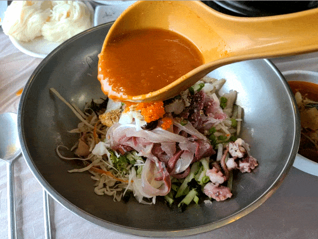 따로 나온 물회 소스를 취향껏 뿌려준다