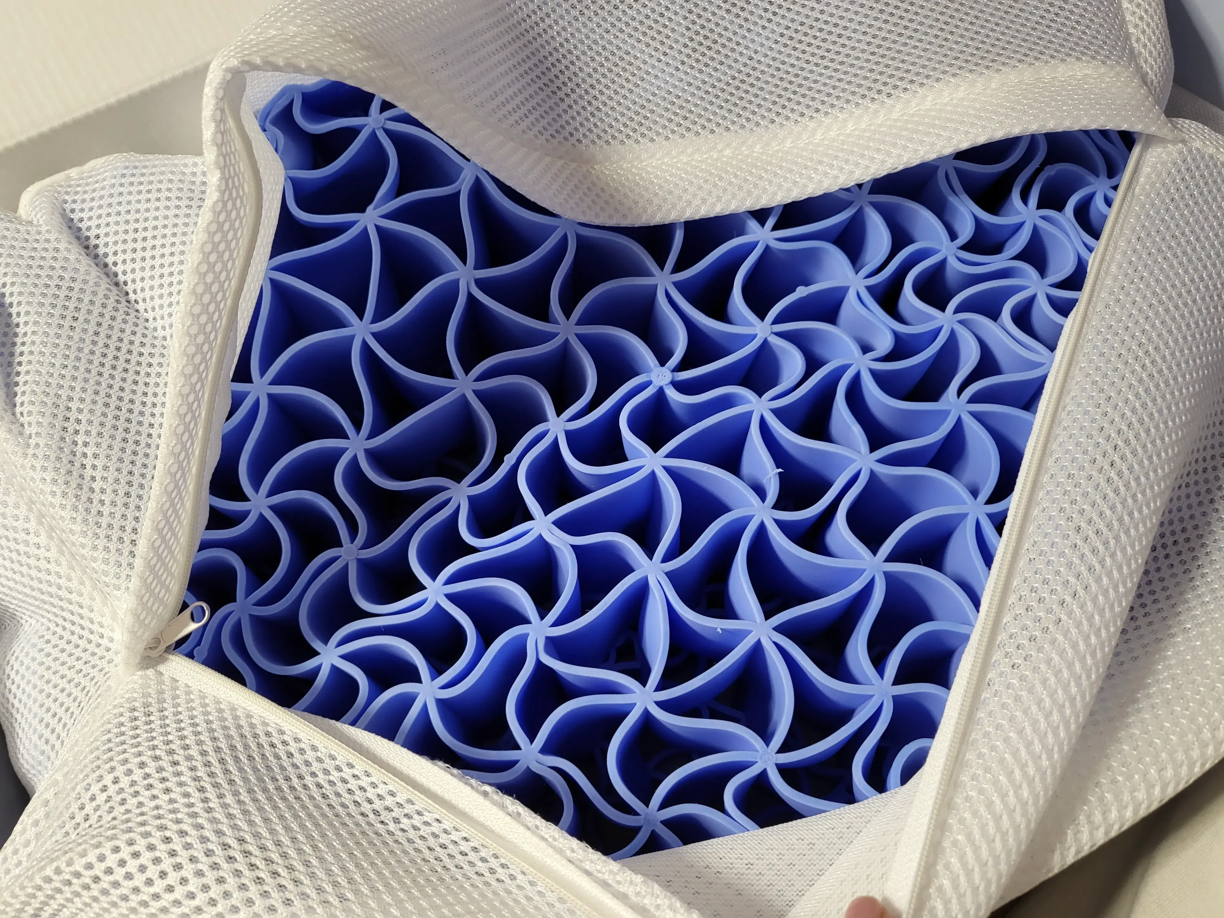베개 커버를 한번 열어보니 파란색 그물 재질?