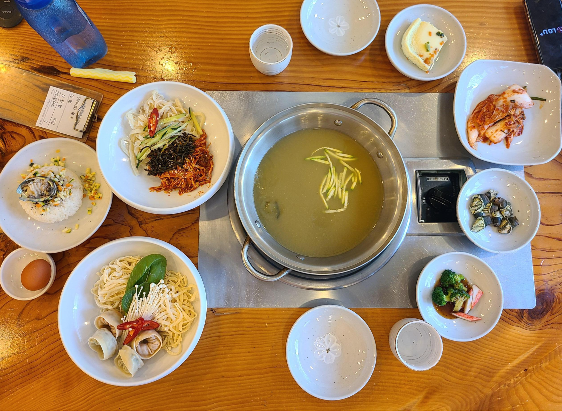 칼국수 육수와 함께 죽 재료, 기본 반찬들이 나오고