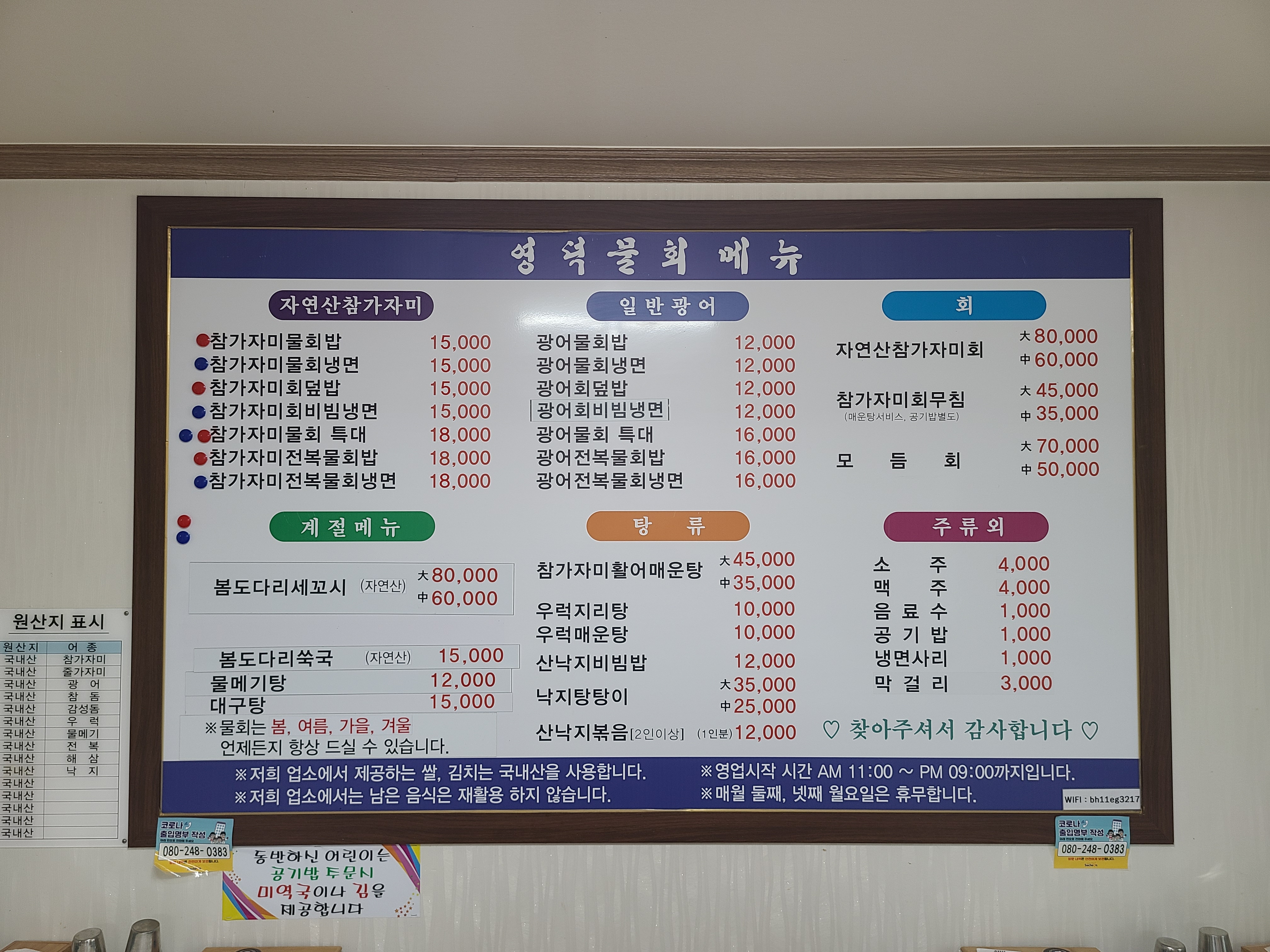 다양한 종류의 물회들이 있고 회 메뉴도 보인다