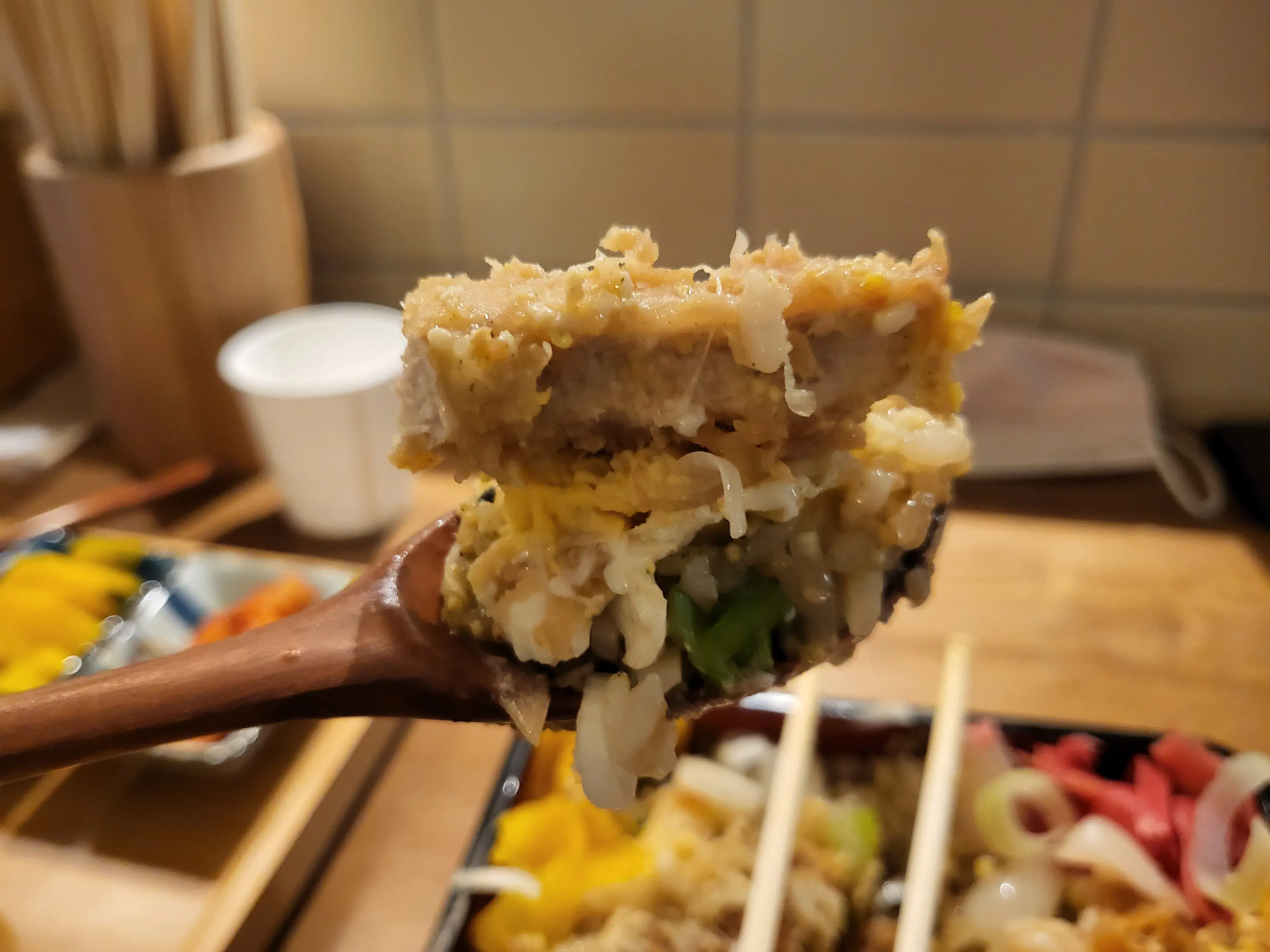 밥 한 숟갈과 돈카츠 하나를 올려서 먹으면