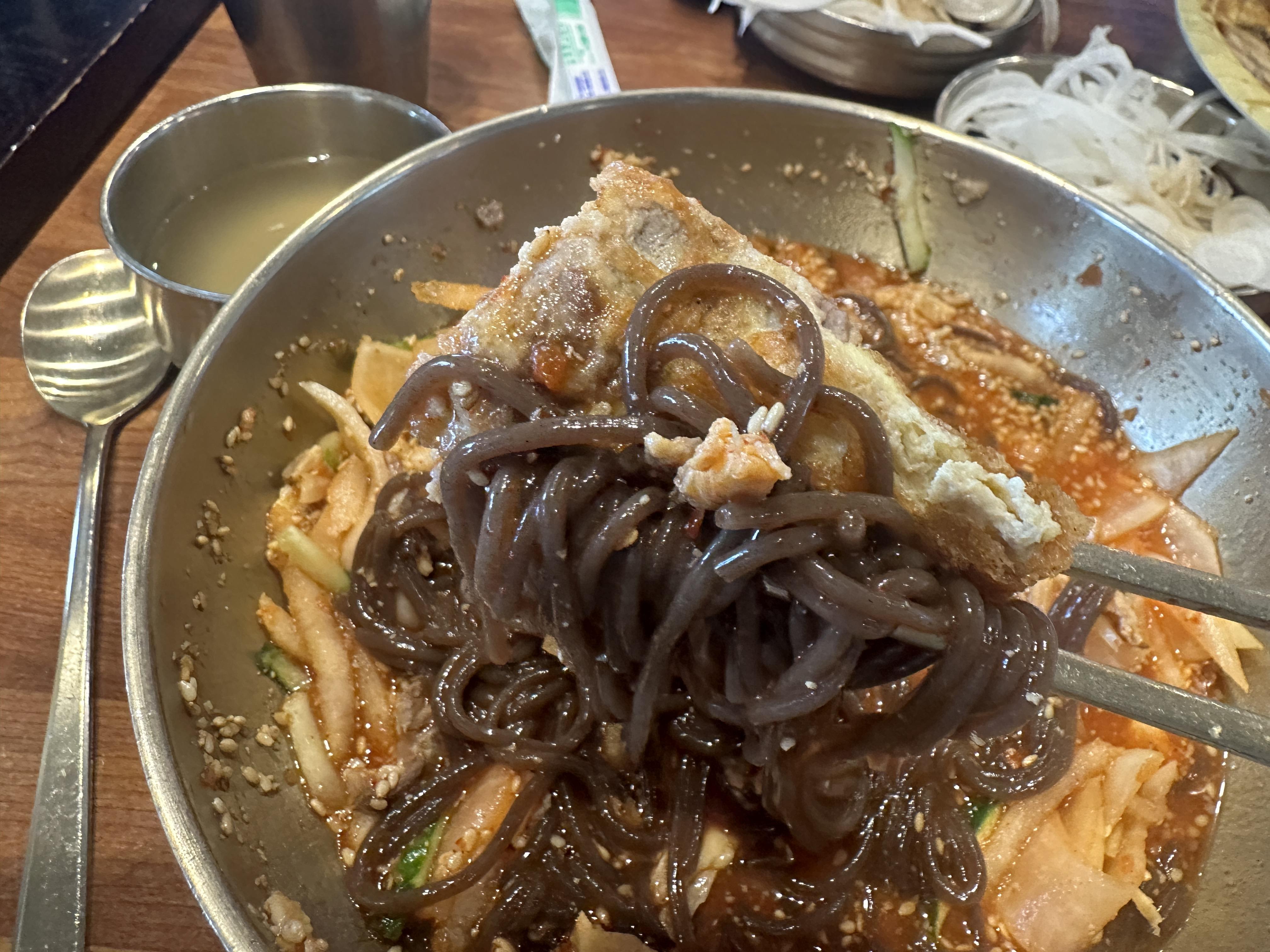 육전과 냉면을 한입에 먹는 게
