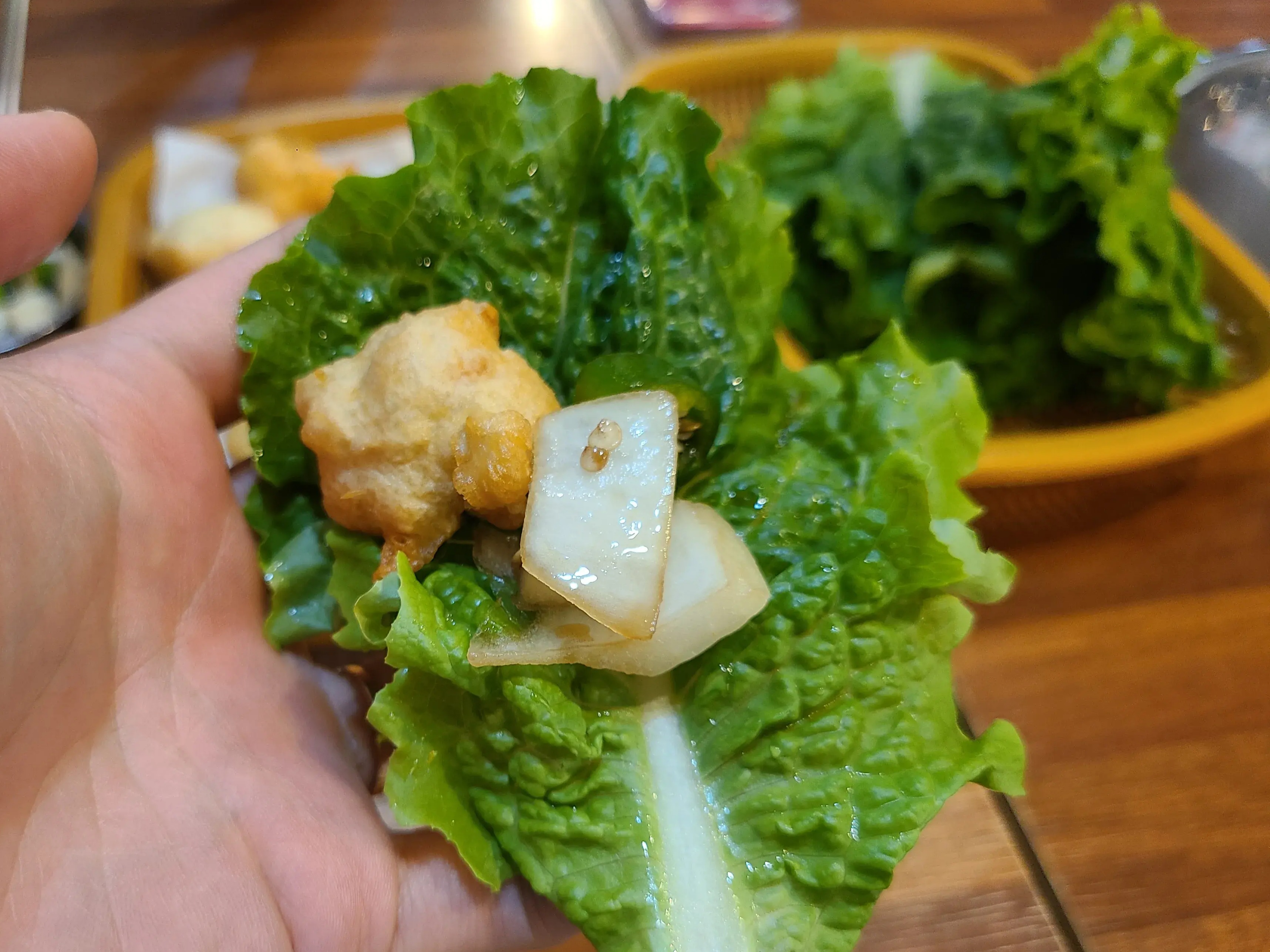 튀김을 상추에 싸 먹는 이색 음식