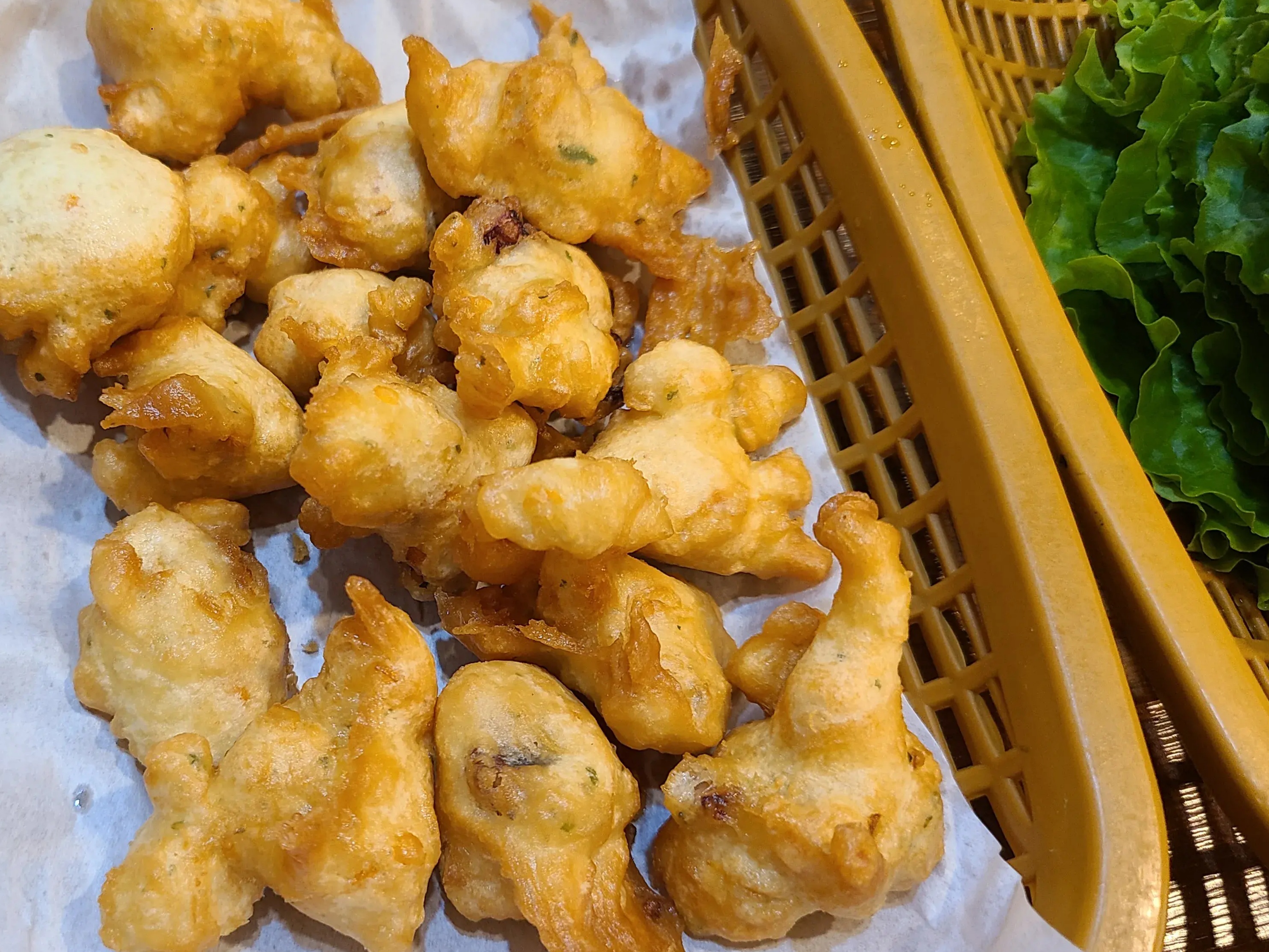 상추와 튀김이 각각 소쿠리에 담겨 나온다