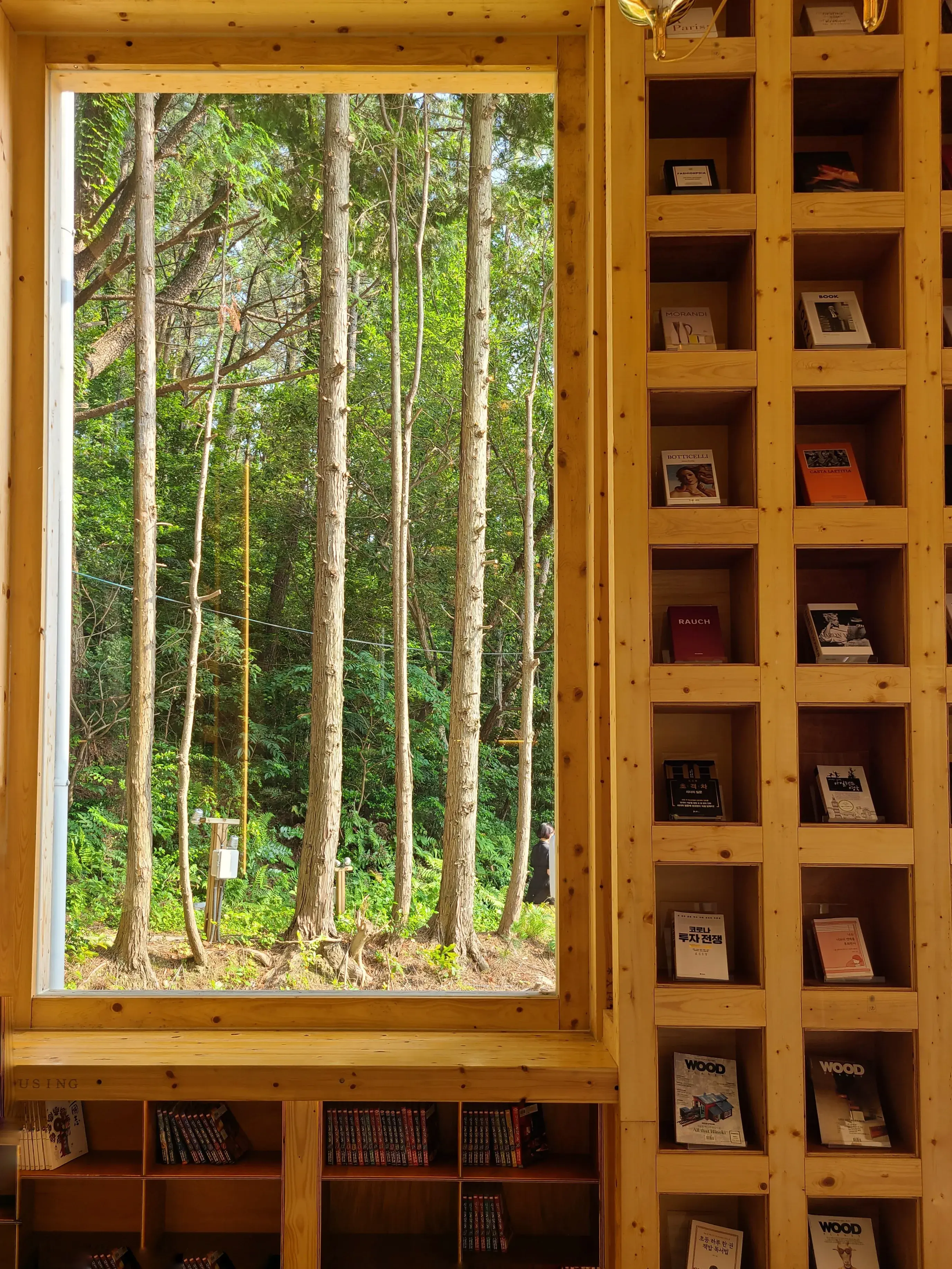 큰 유리창 밖으로 길쭉한 나무들이 보이고