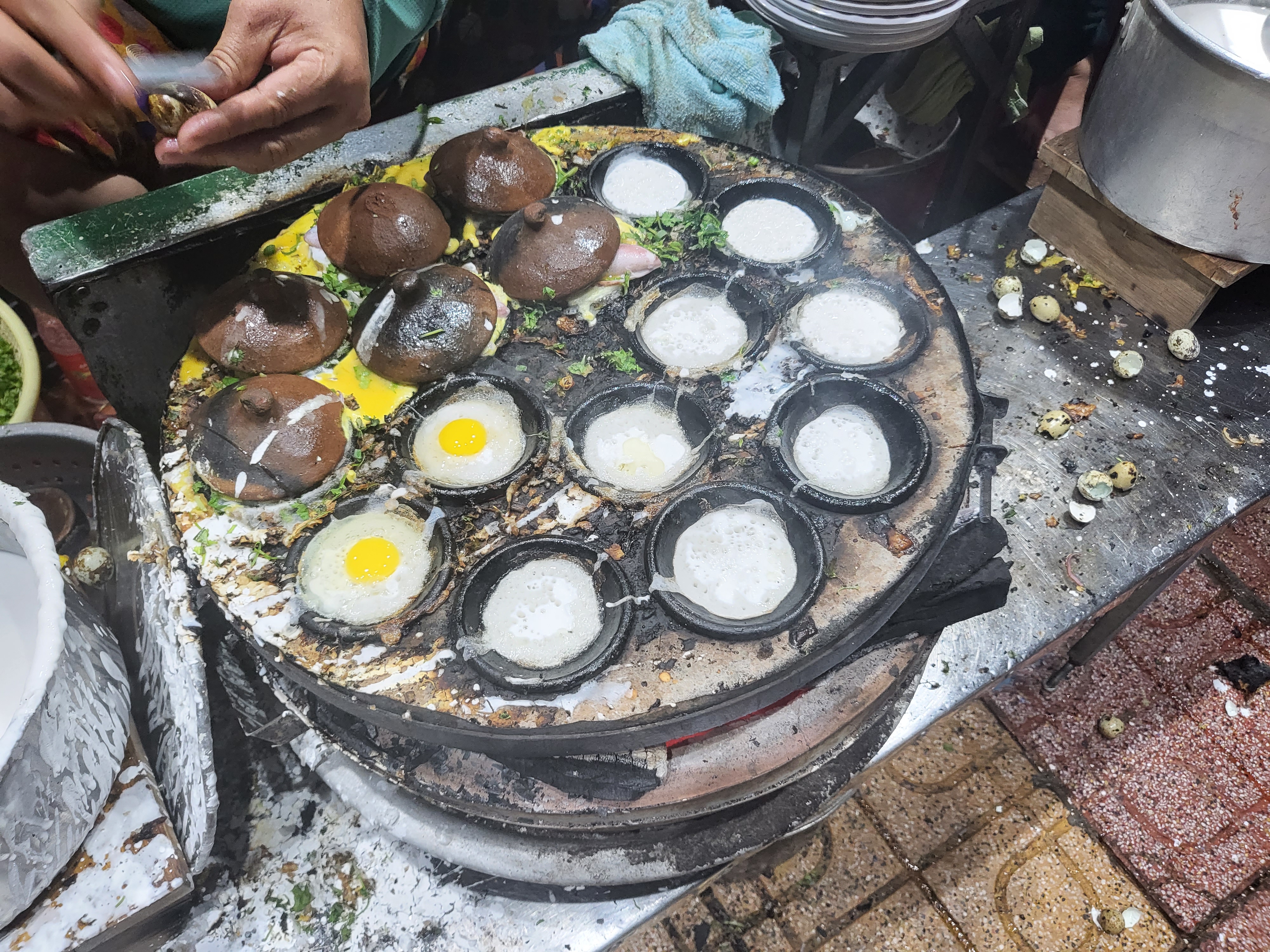 동그란 틀에 반죽과 계란을 넣어 굽고 계신다