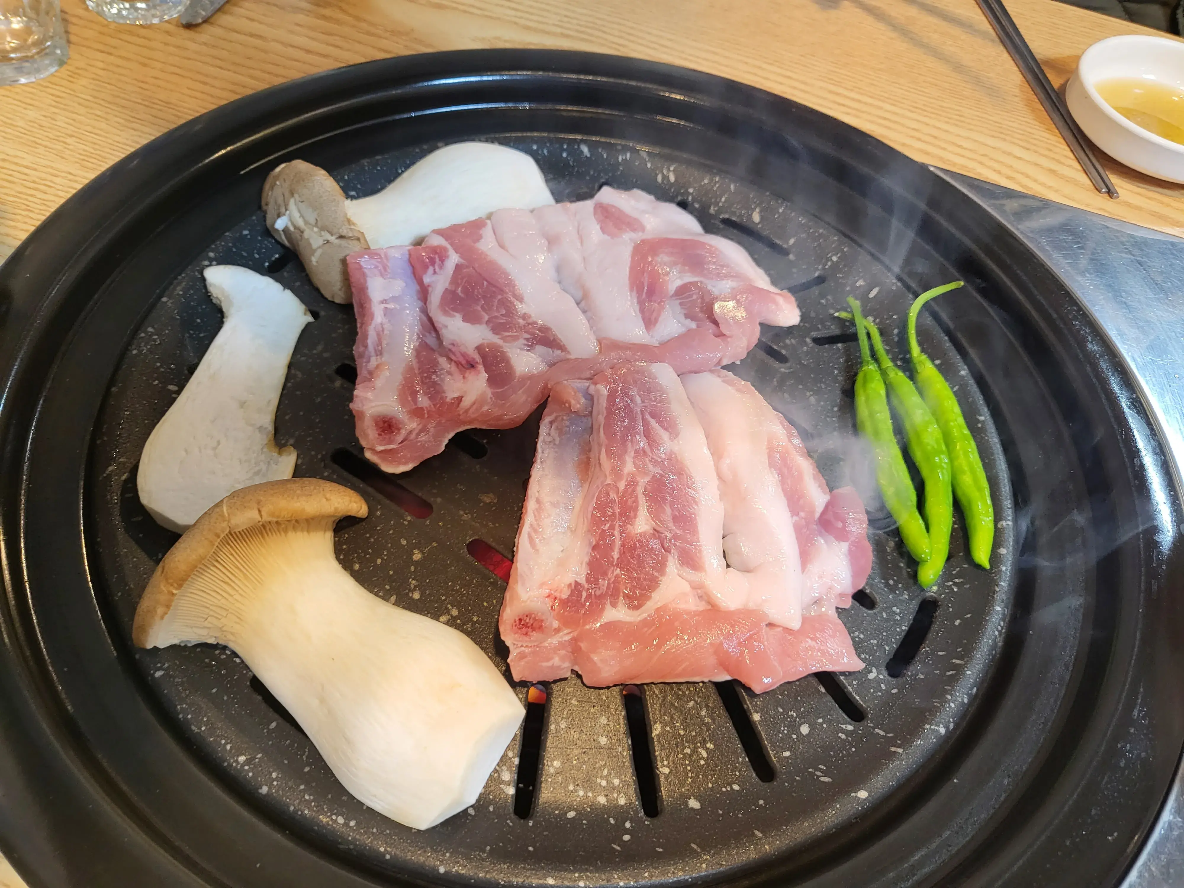 두툼한 생갈비가 꽈리고추(?)와 같이 나왔다