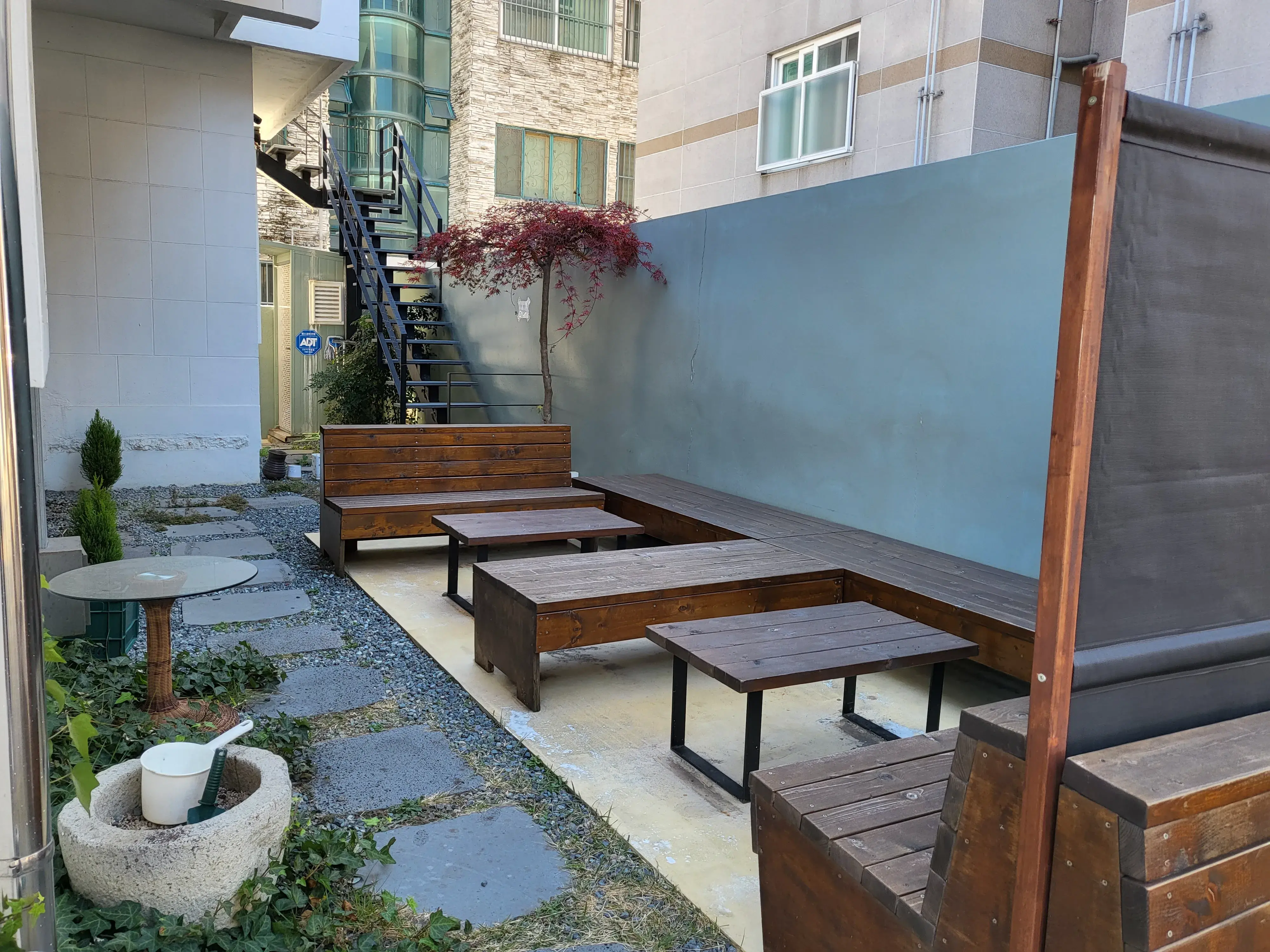 야외에도 테이블이 있고 옥상으로 가는 계단도 보인다