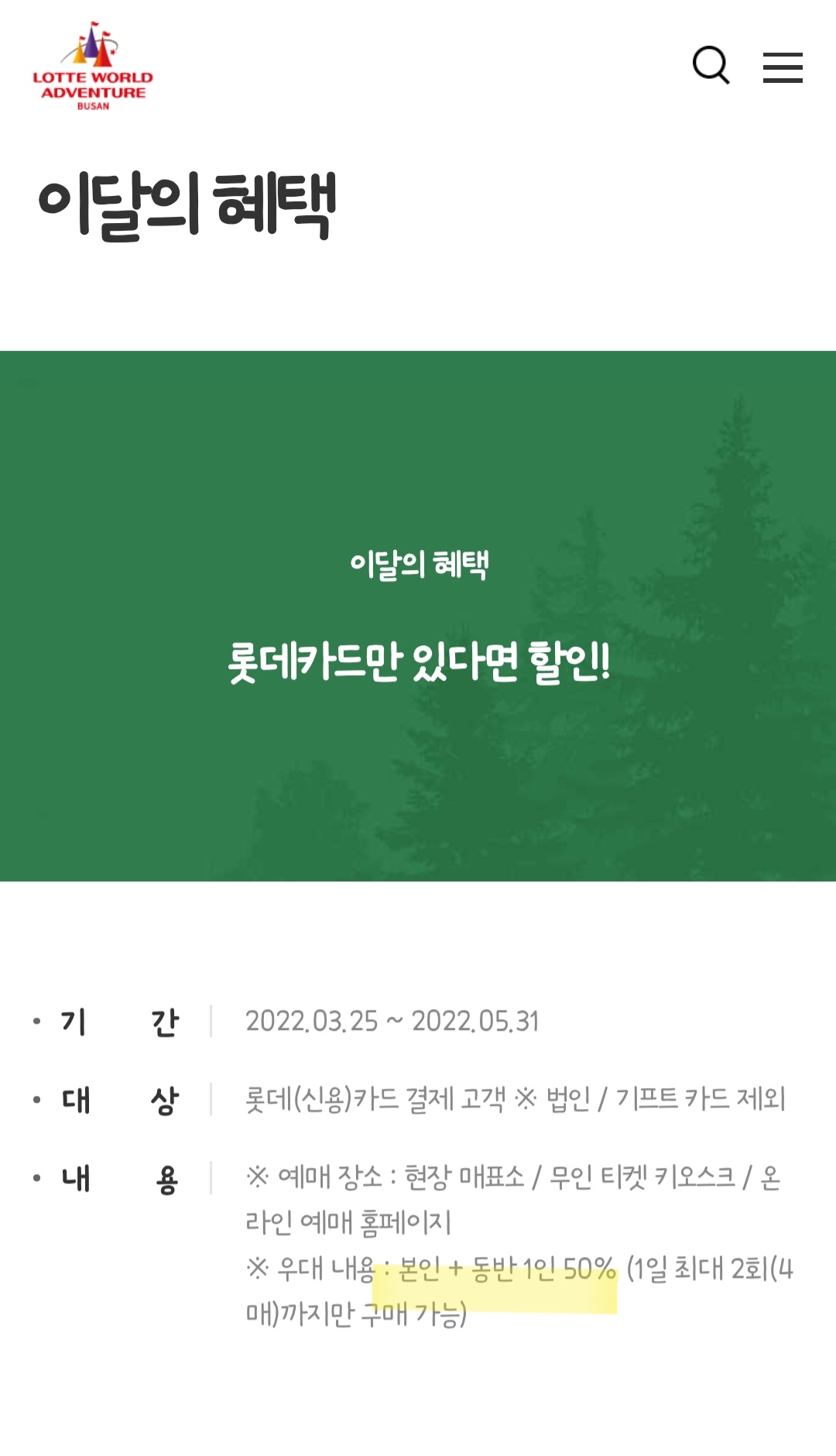 본인 + 동반 1인까지 50% 할인된 금액으로