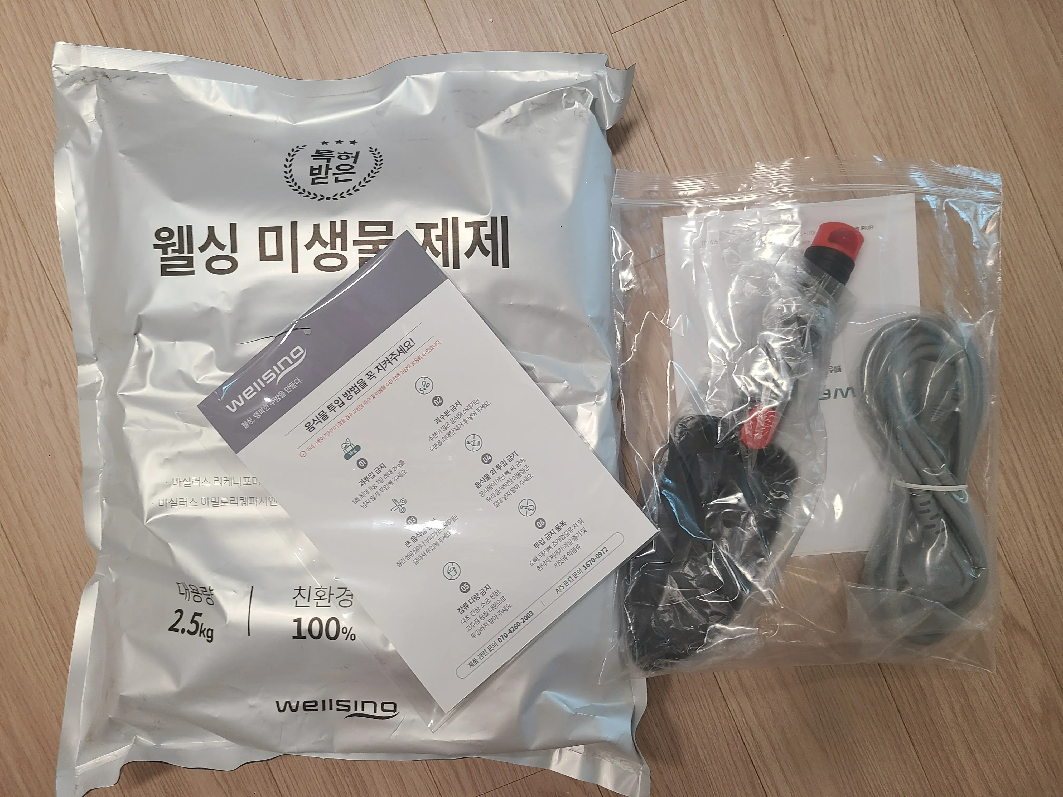 구성품으로는 미생물 제제, 전원코드, 삽 그리고 설명서