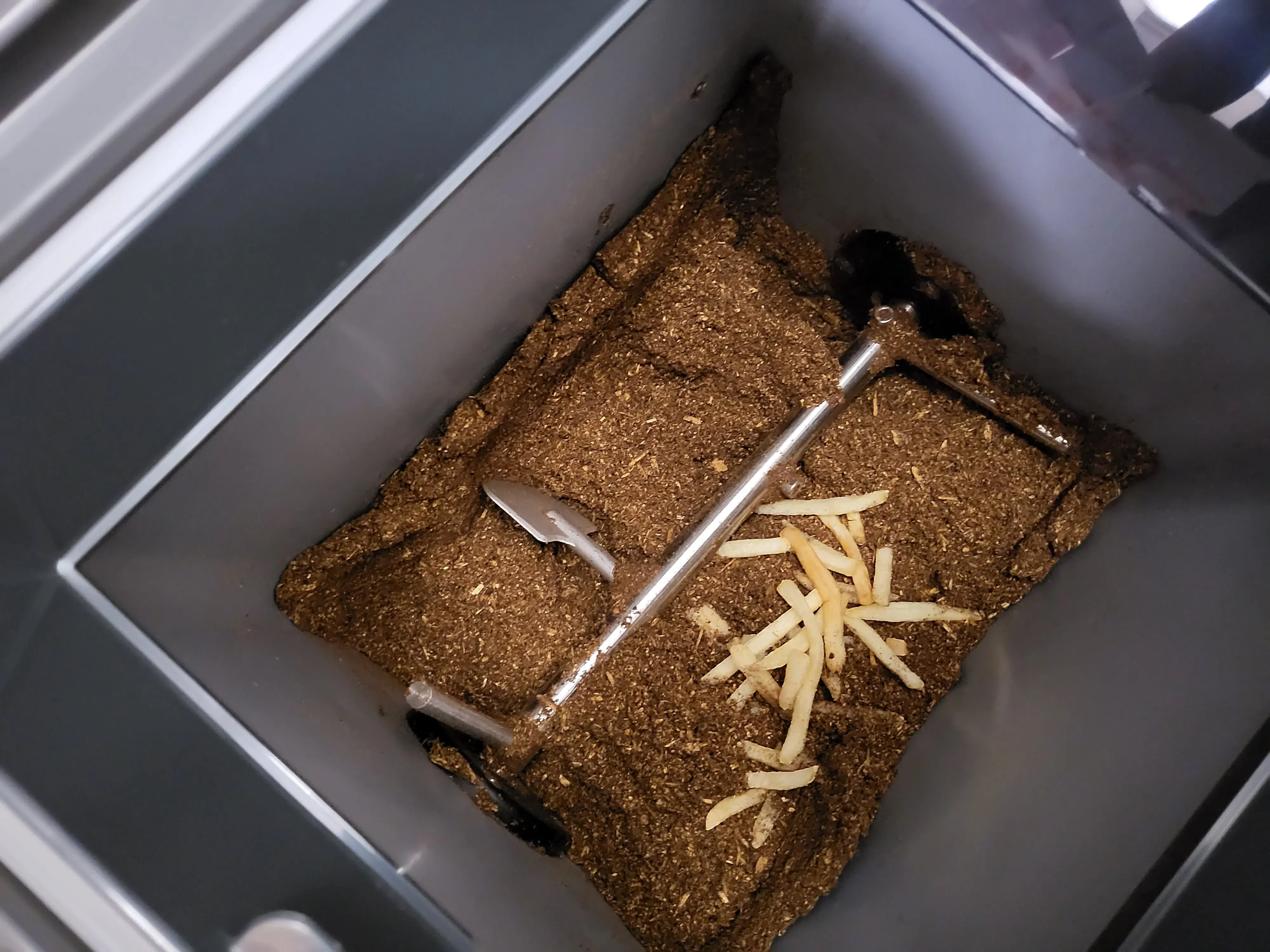 음식물 처리기 뚜껑을 열고 감자튀김을 넣어준다