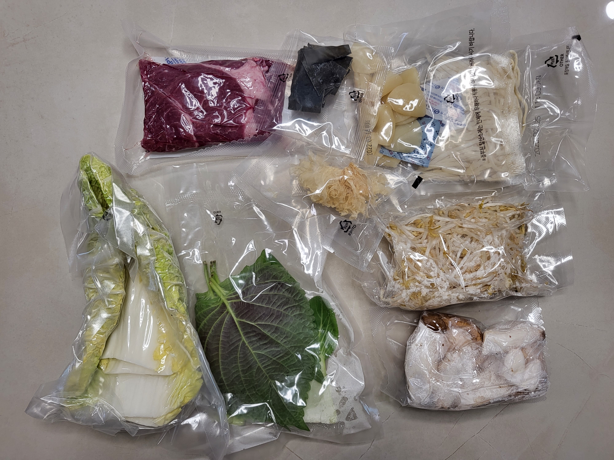 밀푀유나베에 들어가는 야채들이 진공포장되어있다