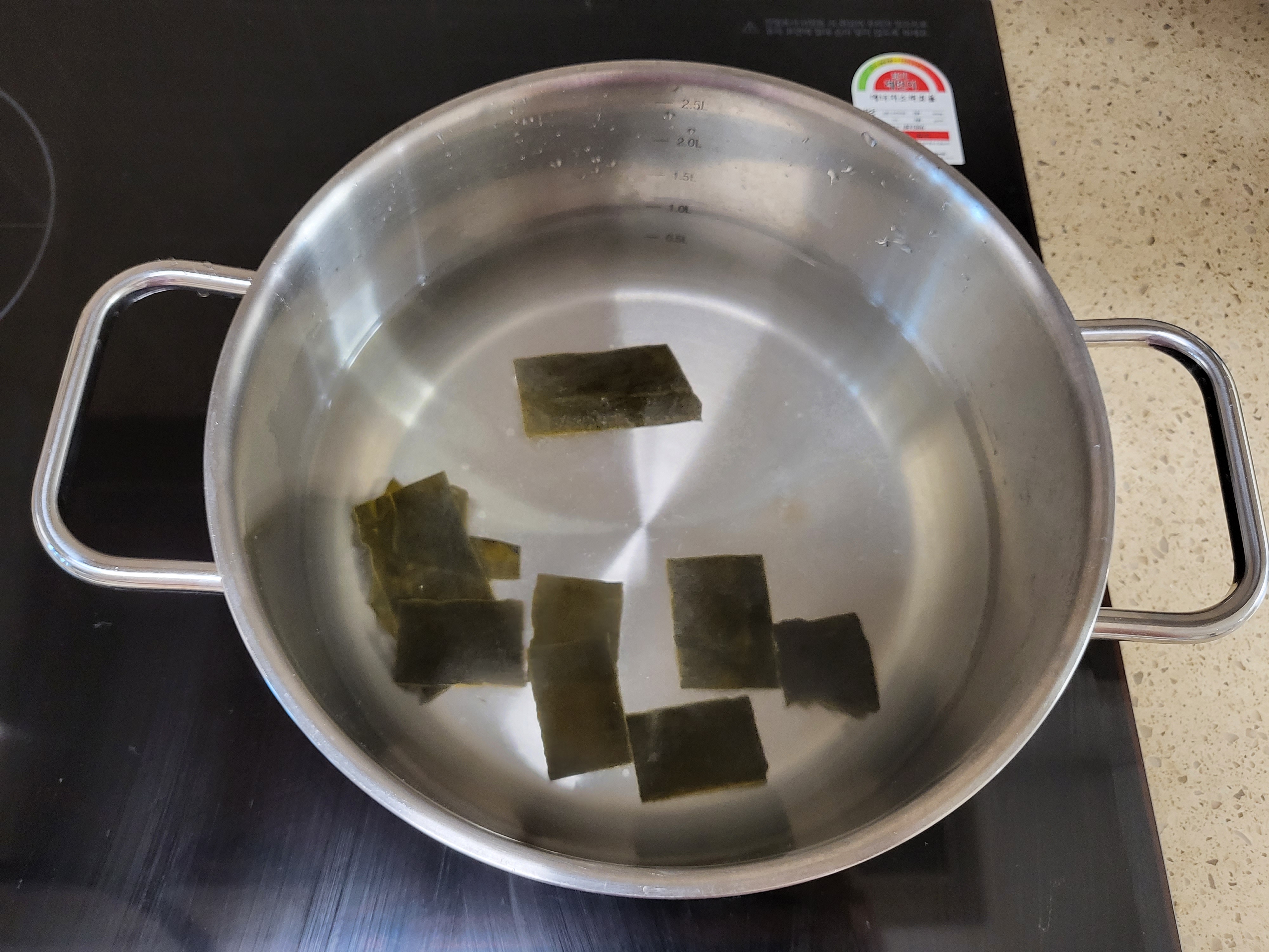 계량된 물에 다시마, 나베 육수를 넣고 끓여준다