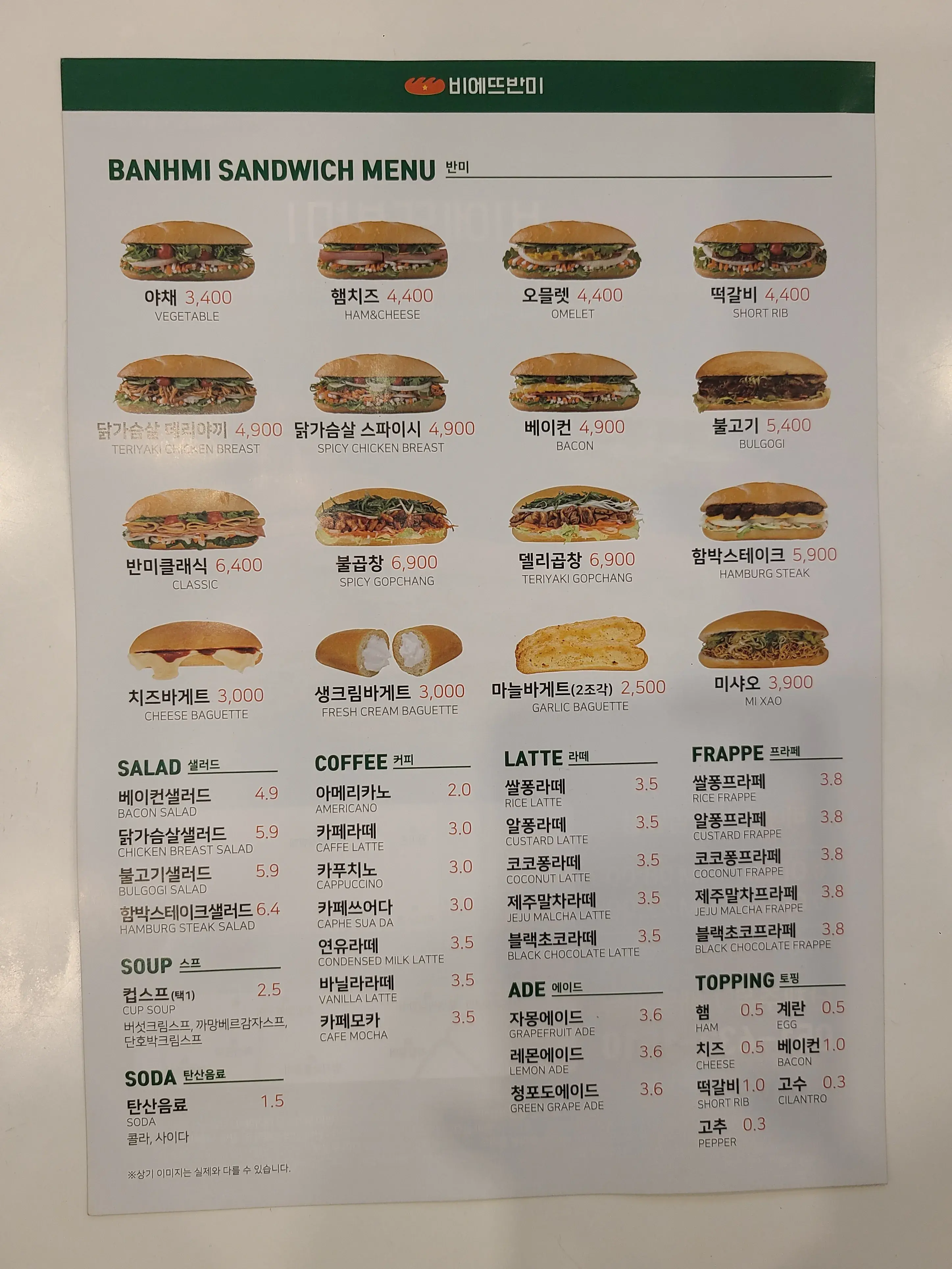 다양한 메뉴의 반미 샌드위치와 음료들