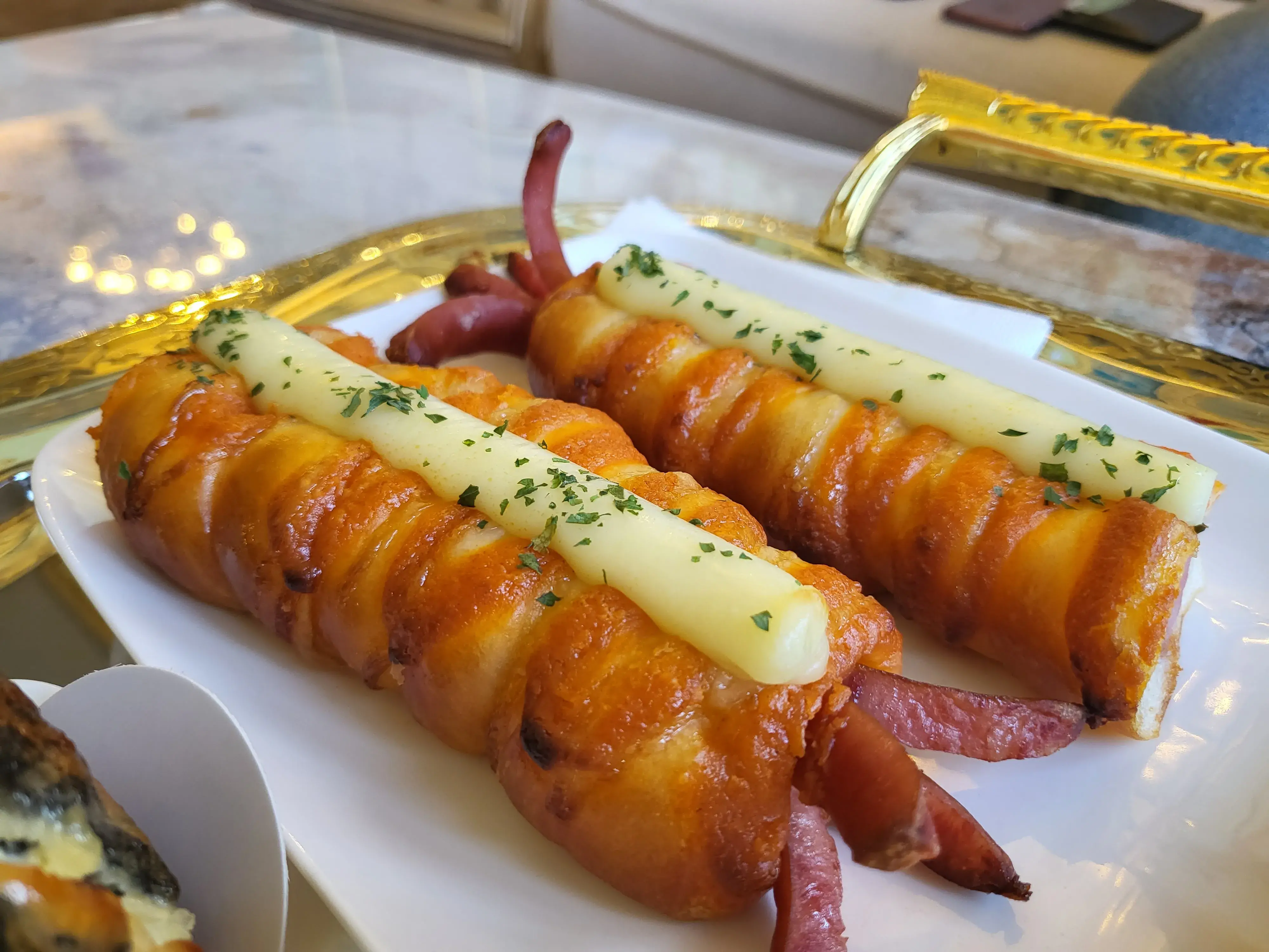 소시지빵 하나와 크림치즈가 들어간 갈릭 빵
