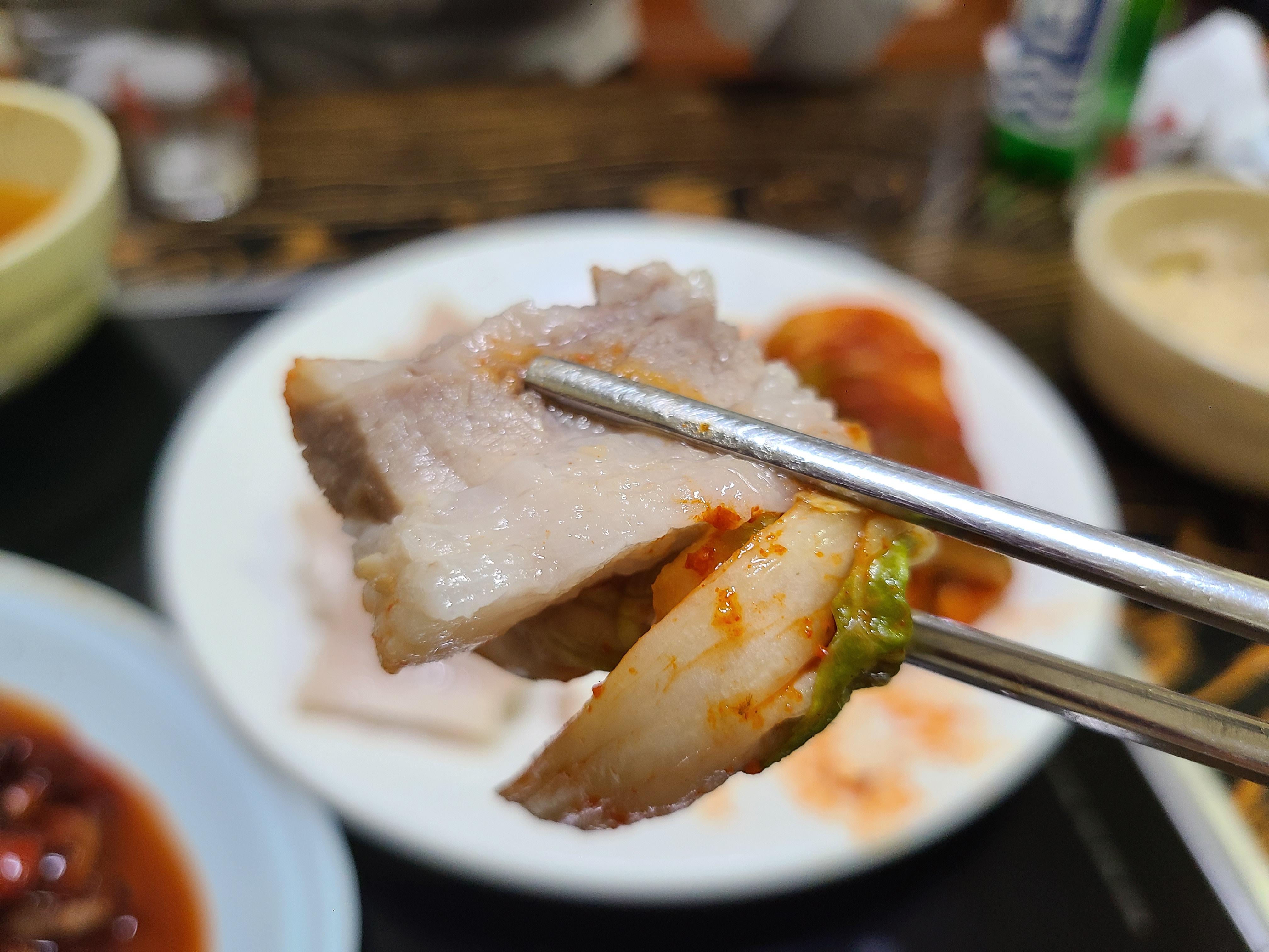 수육 한 점과 보쌈김치를 올려서 같이 먹으면