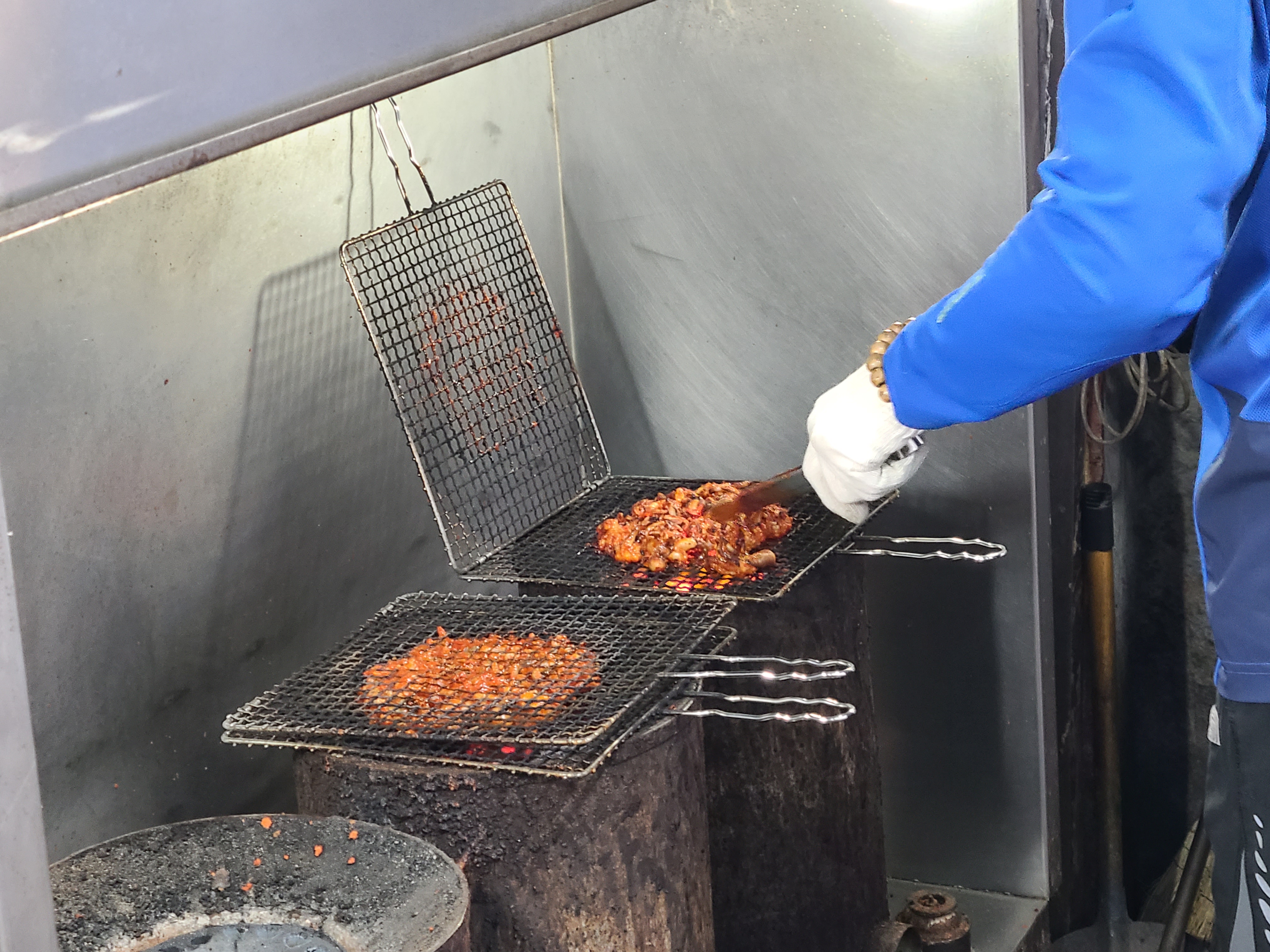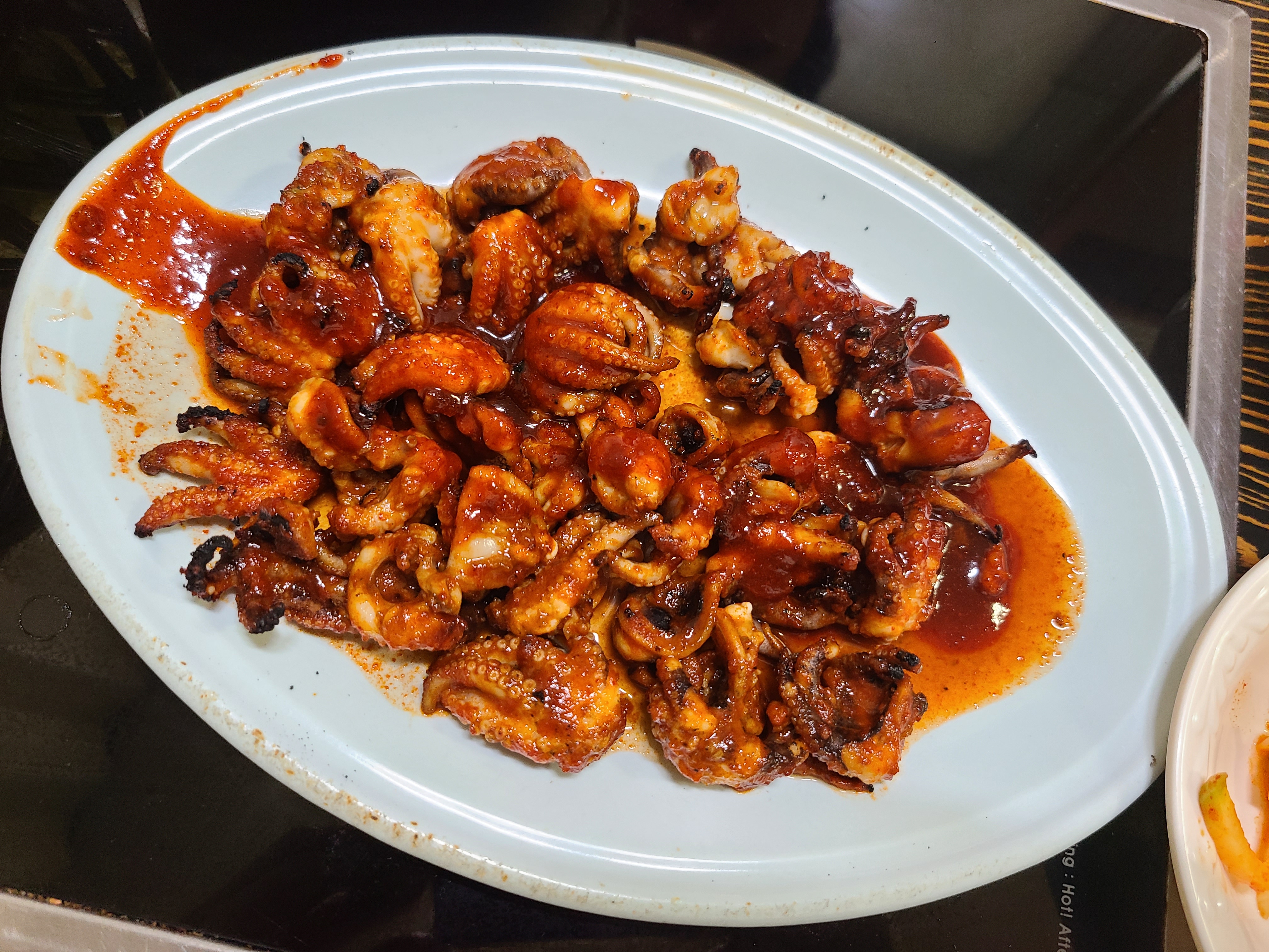 빨간 양념에 연탄불에 잘 구워진 쭈꾸미는
