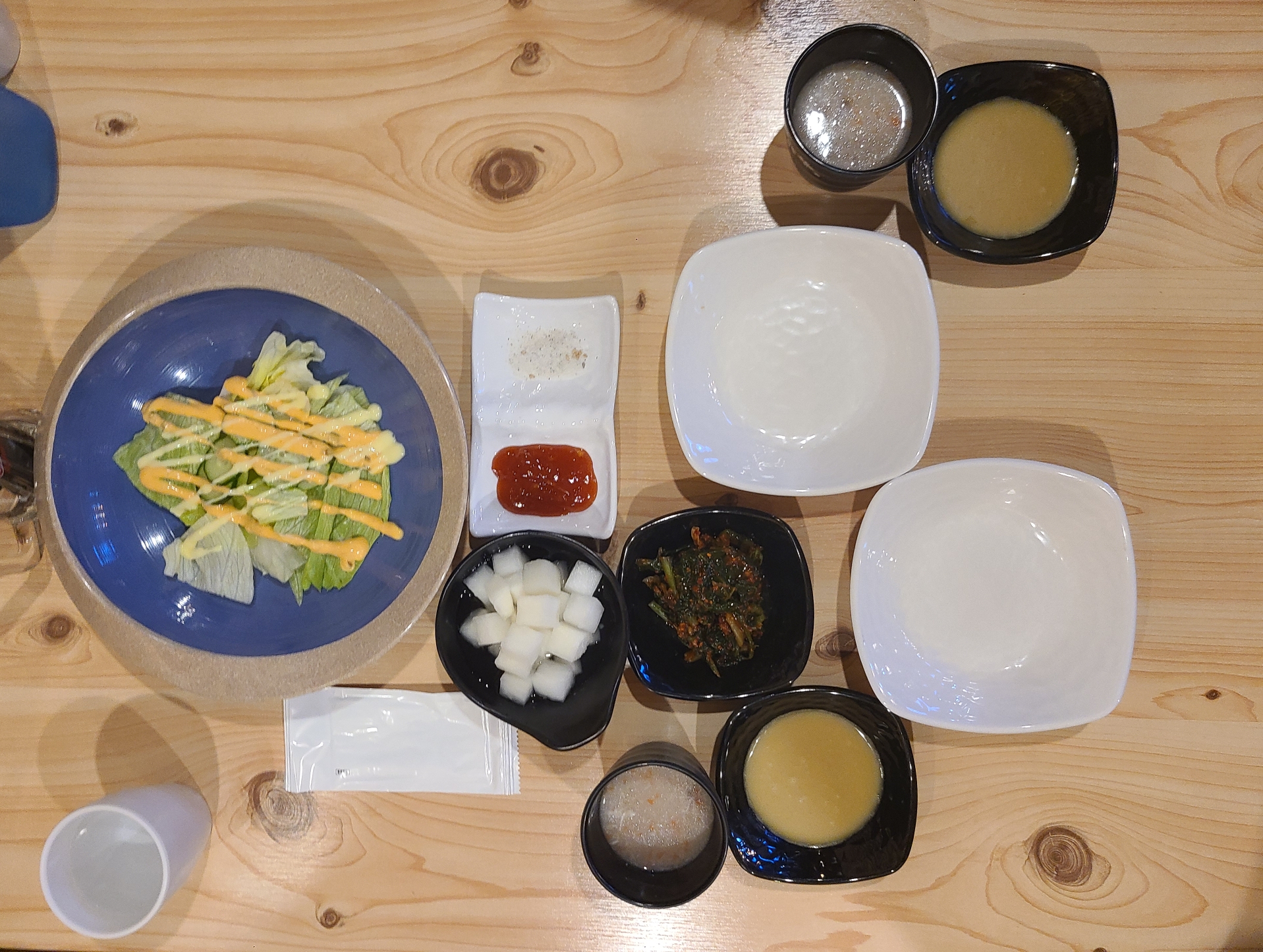 기본 밑반찬, 닭죽 그리고 유부/어묵탕이 나온다