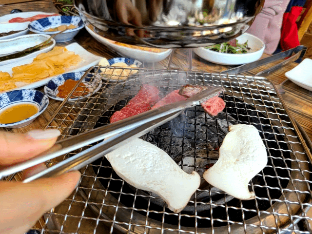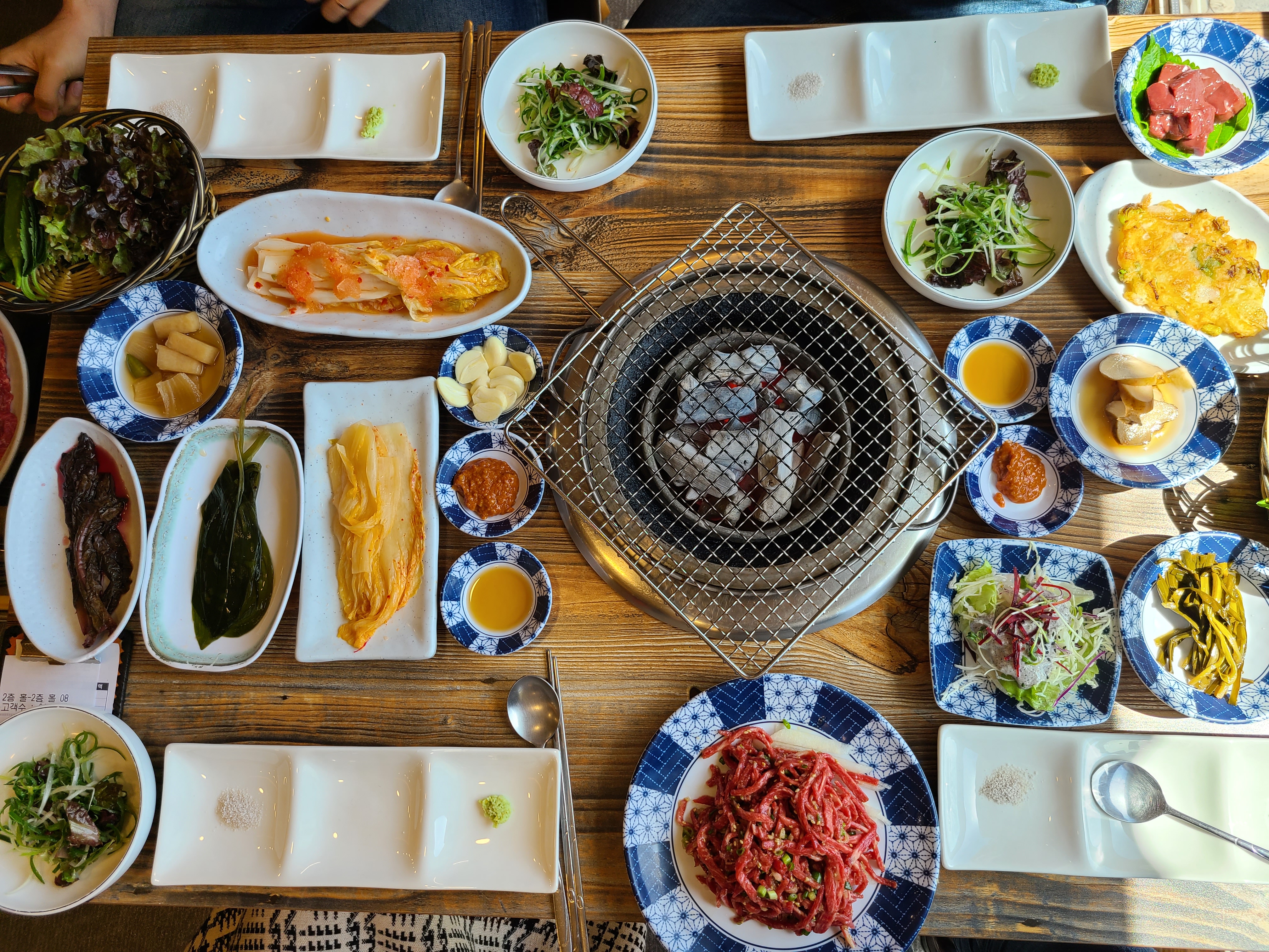 불판이 들어오고 각종 밑반찬들이 세팅되었다