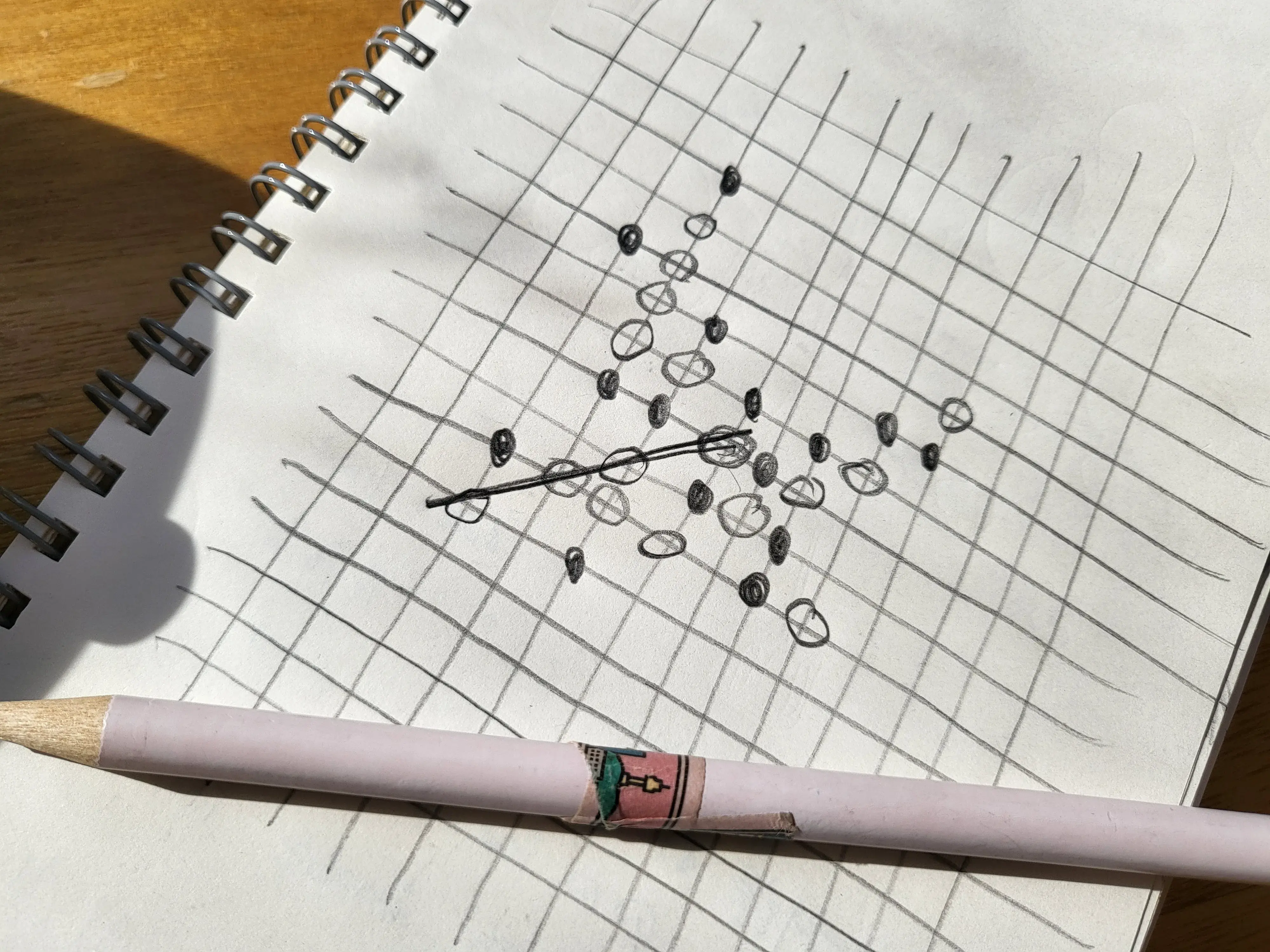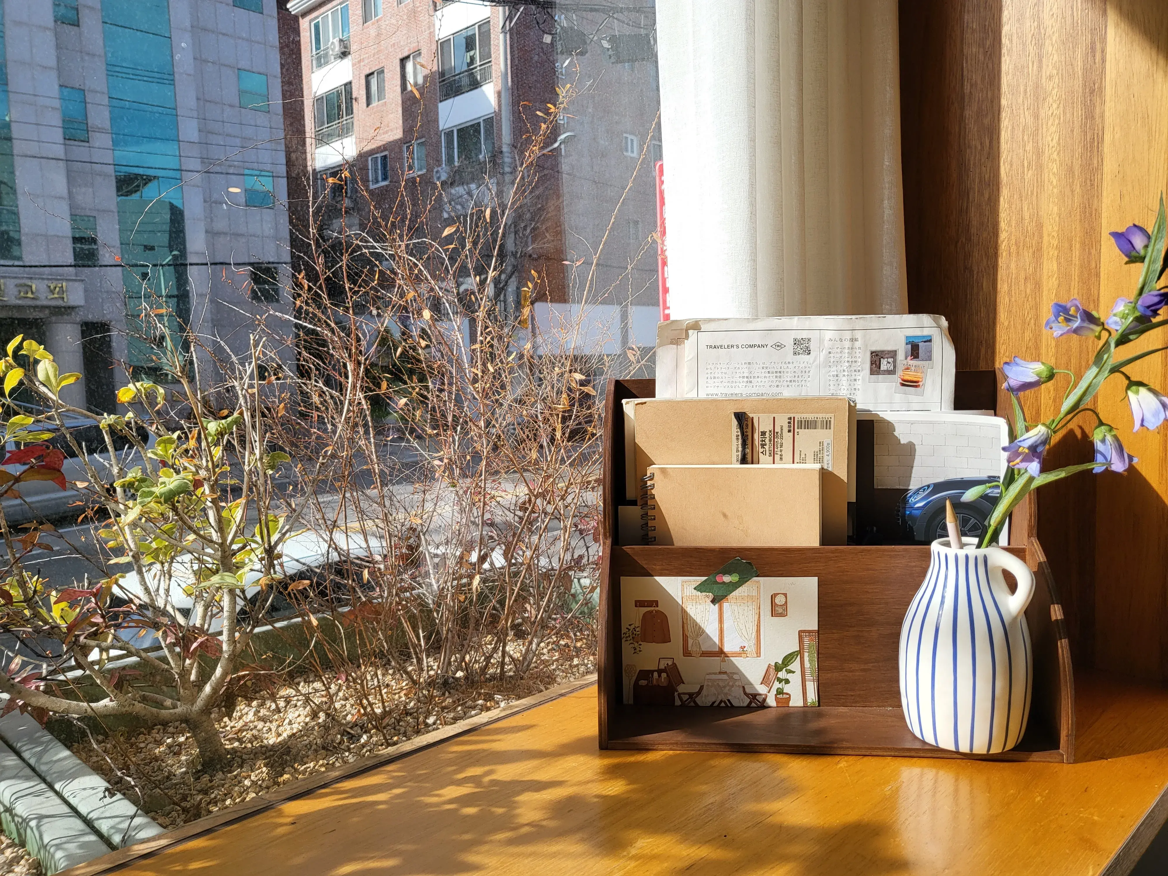 창가에 놓인 노트와 연필이 있길래