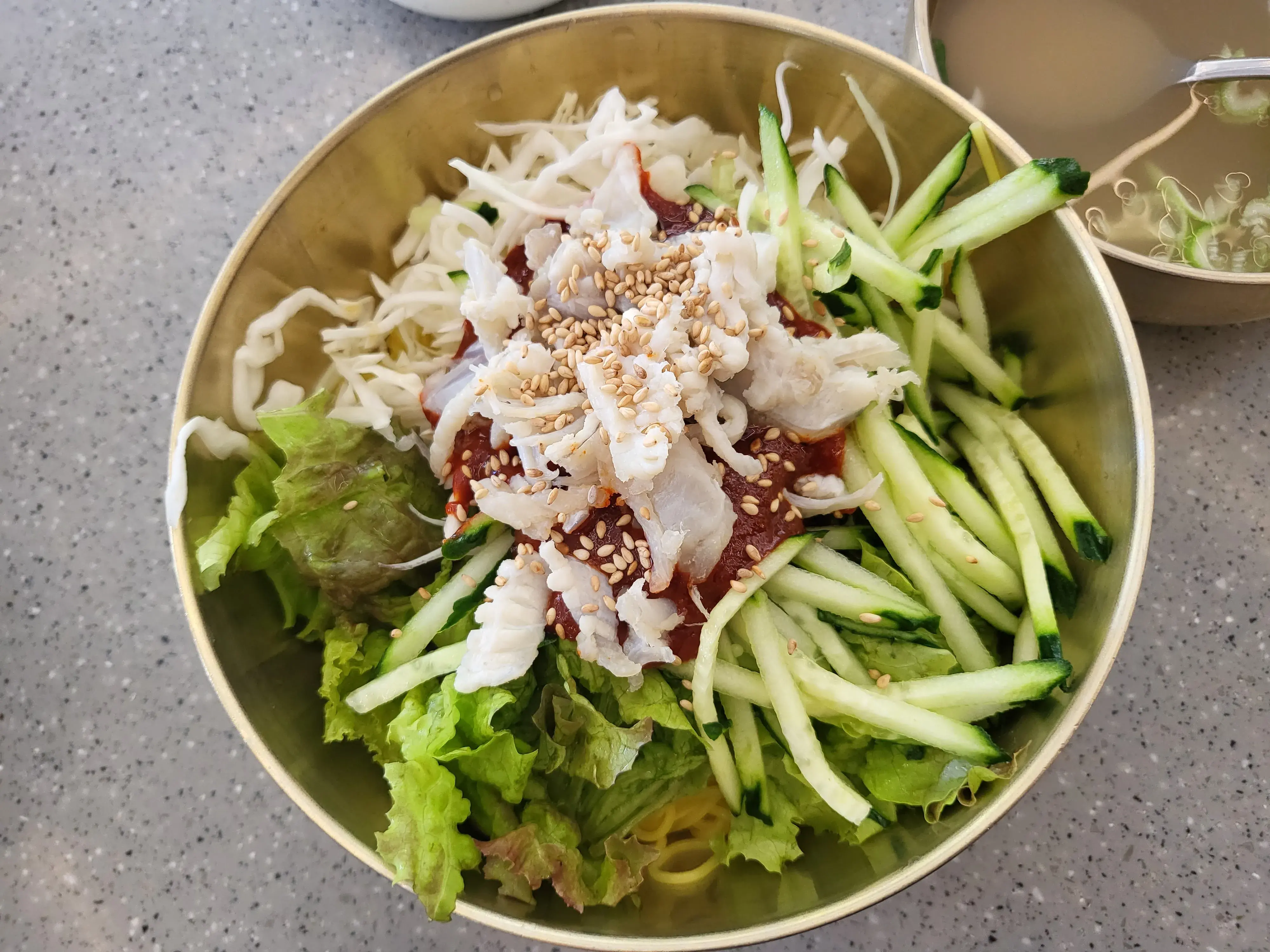 주문한 지 진짜 5분도 안돼서 나온 회국수와 국물
