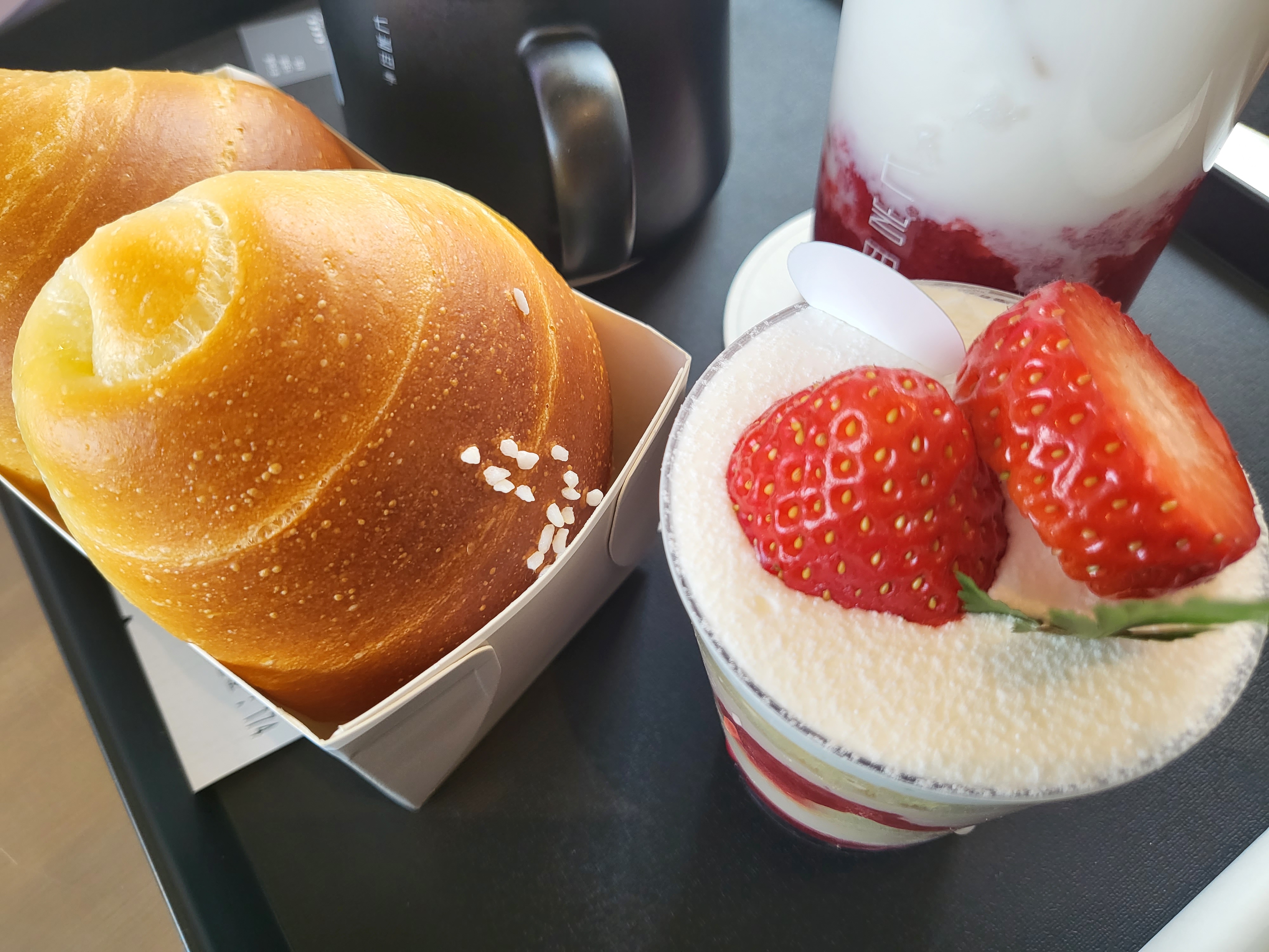 소금빵, 딸기 티라미수, 아메리카노, 딸기라떼