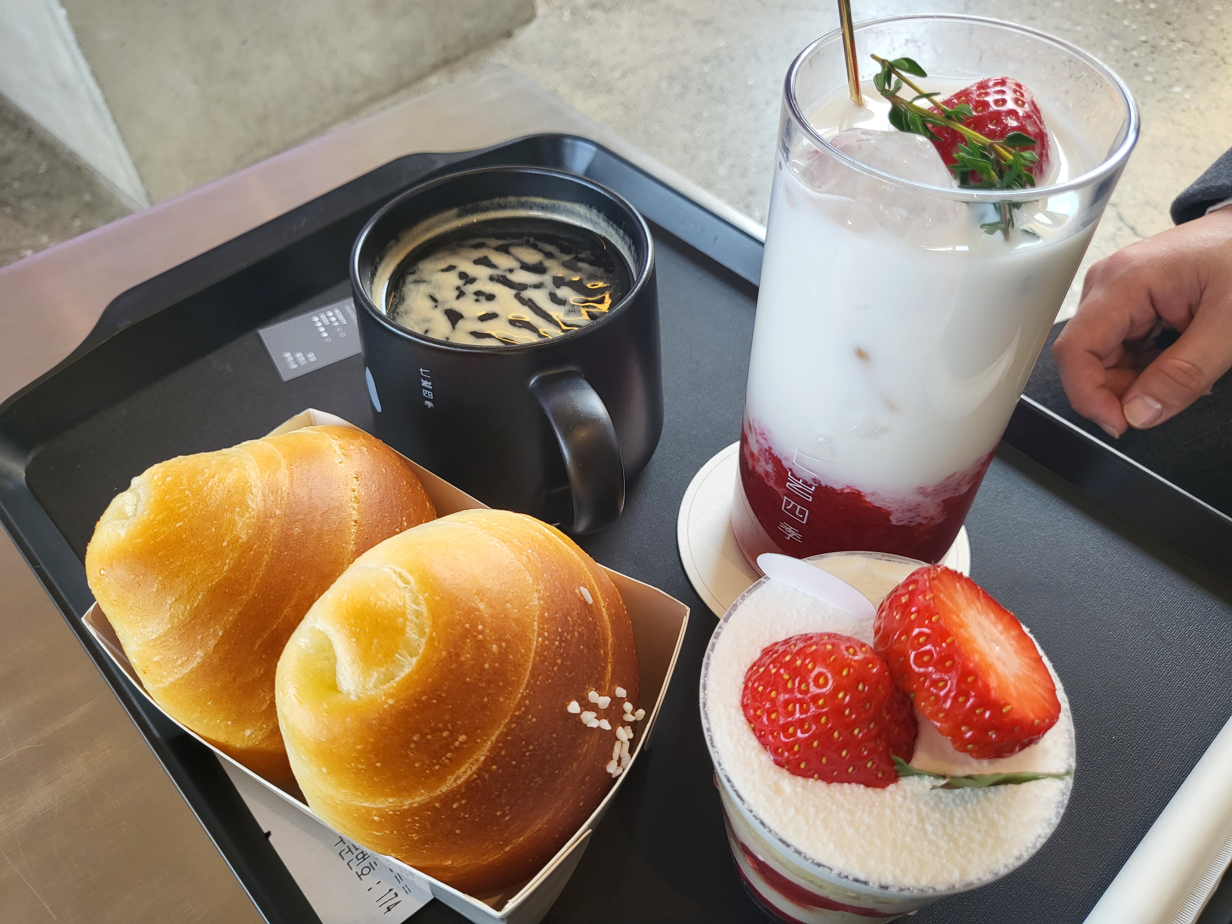 소금빵, 딸기 티라미수, 아메리카노, 딸기라떼