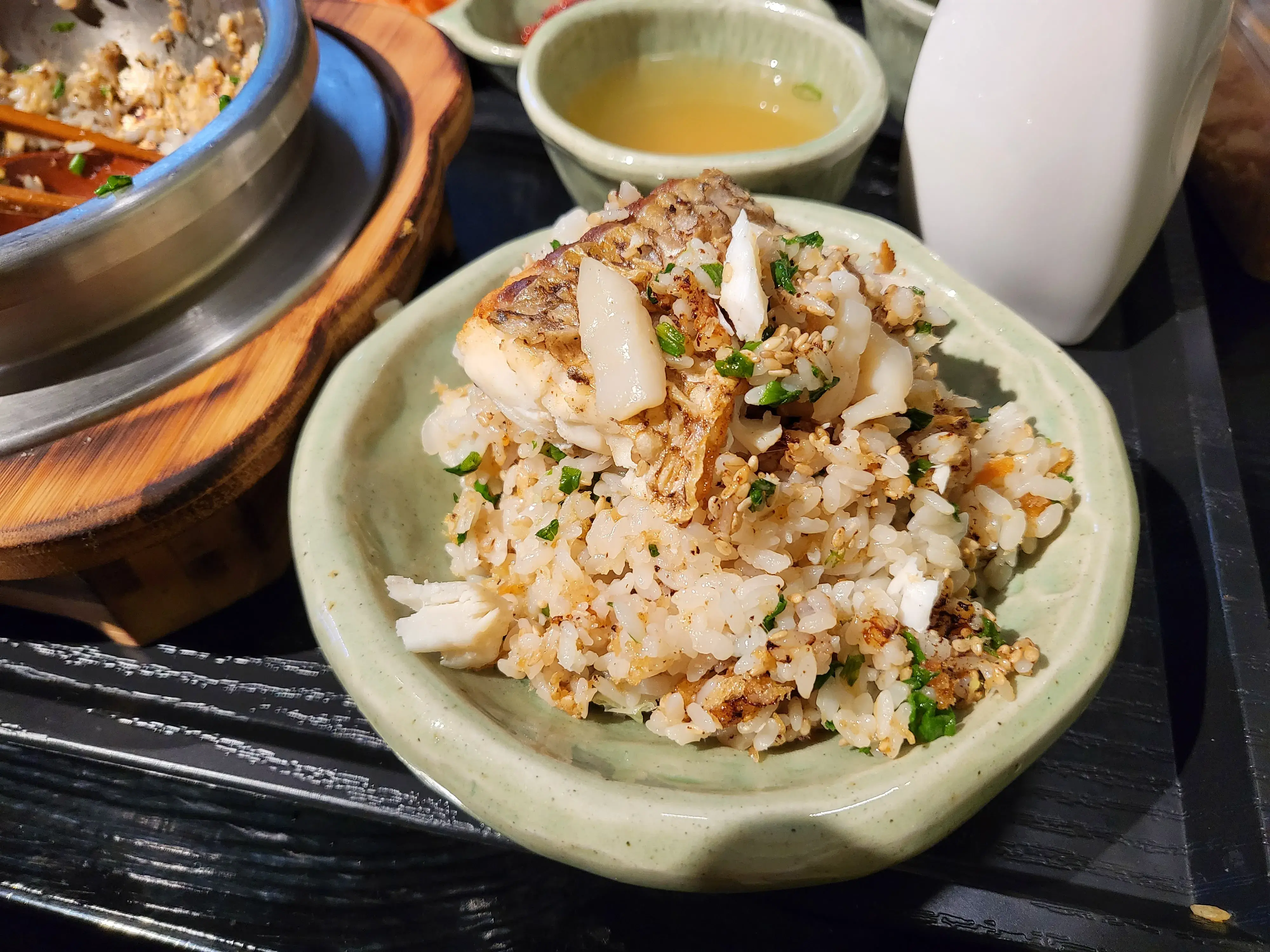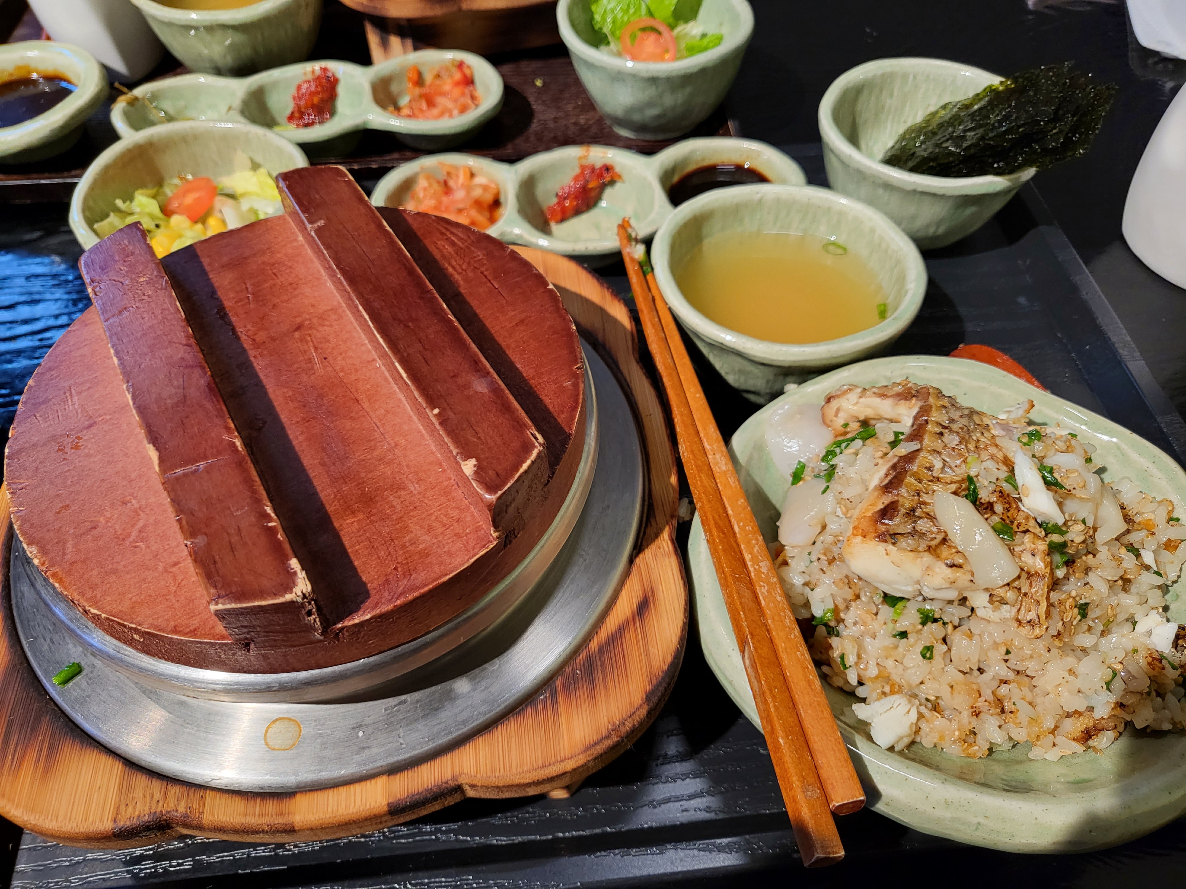 우리는 와규 솥밥 1, 도미 관자 솥밥 1을 주문했다