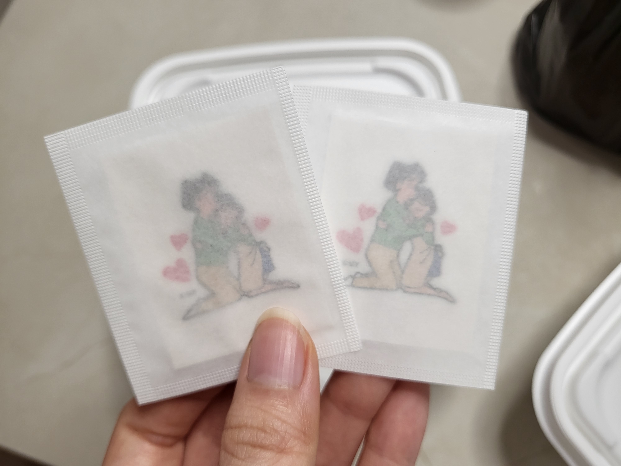 뚜껑 위에는 김과 짱구 스티커가 올려져 있다