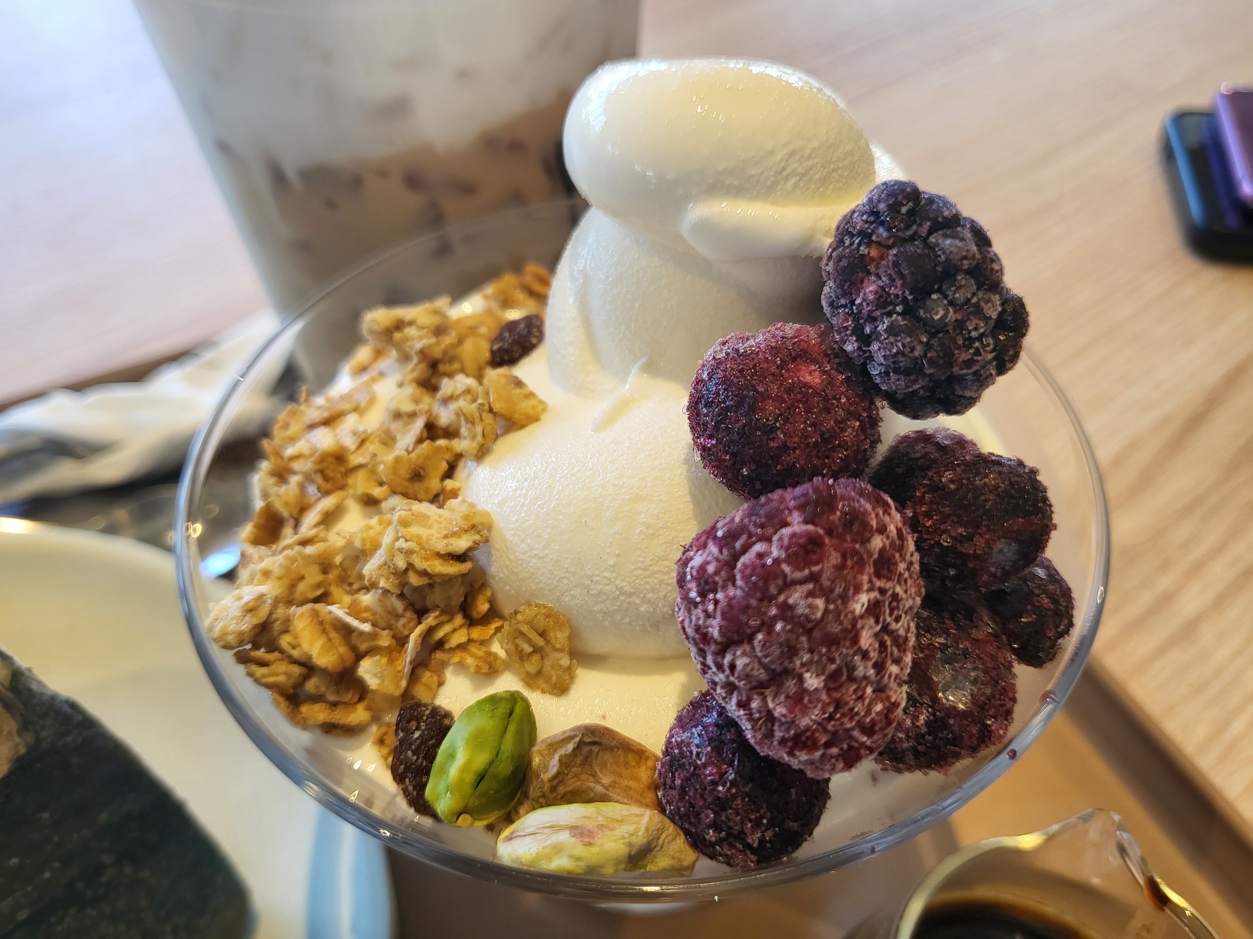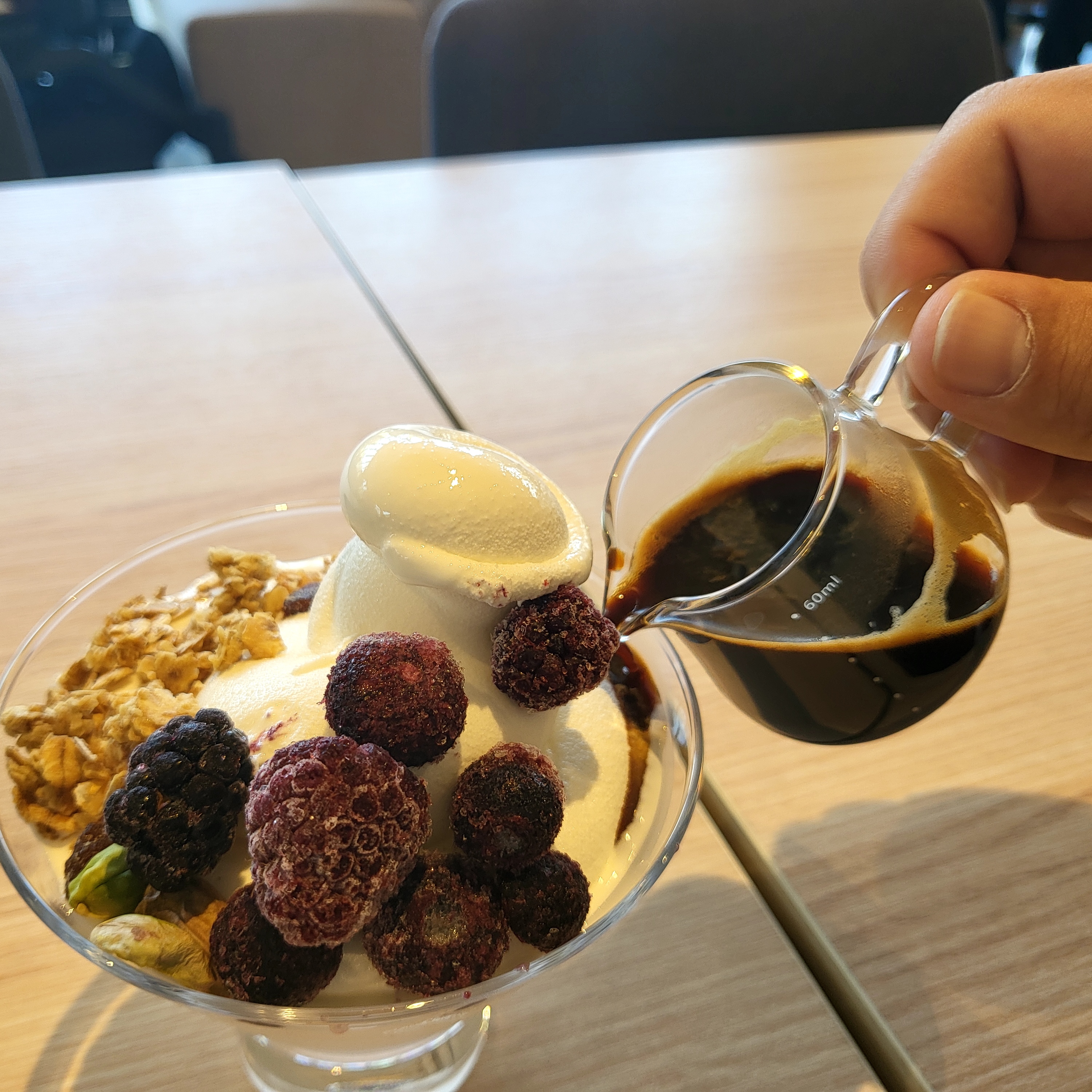 아포가토에는 견과류, 얼린 과일이 올라가 있다