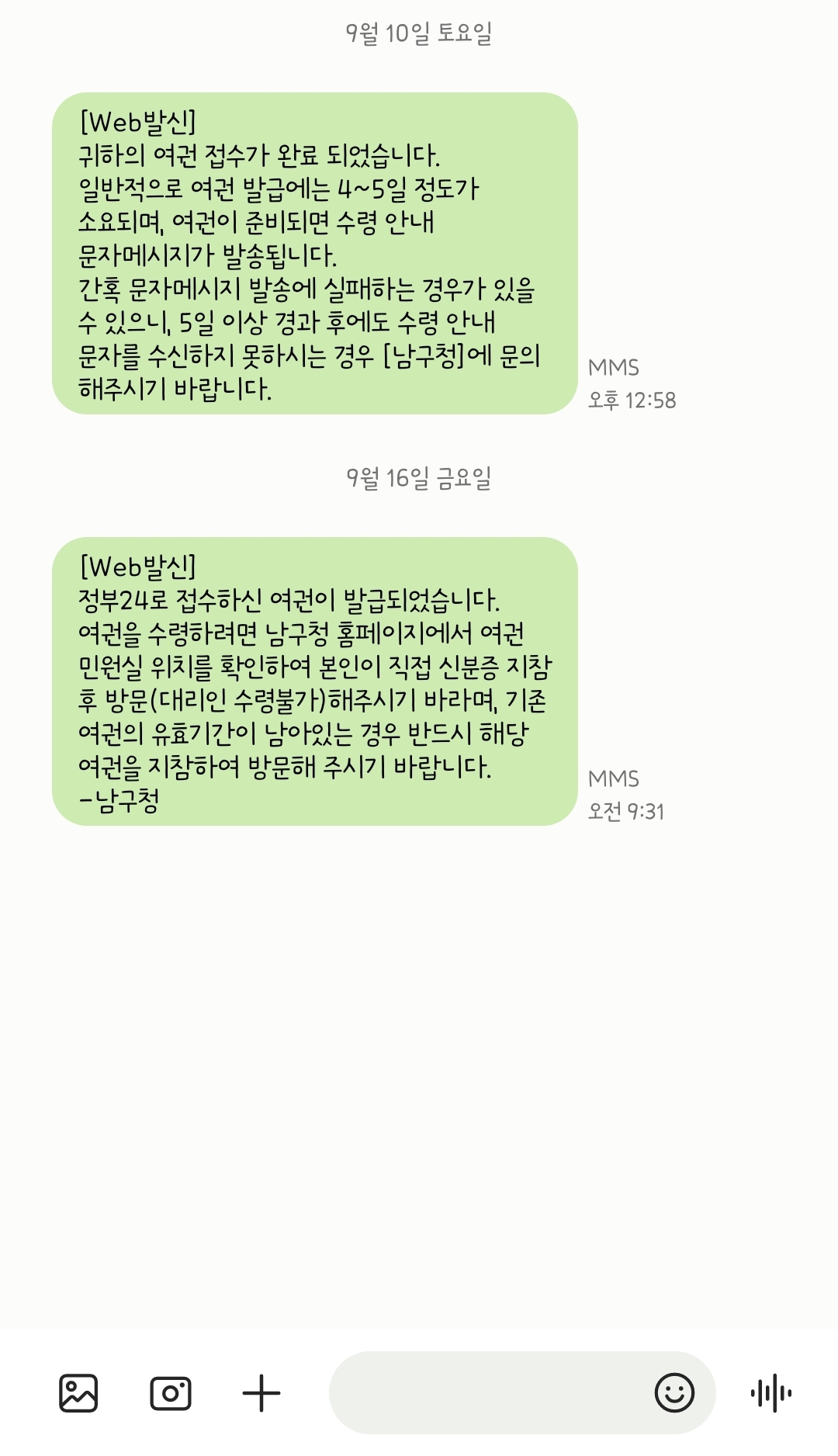 며칠 후 여권 발급이 완료되었다는 문자를 받았다