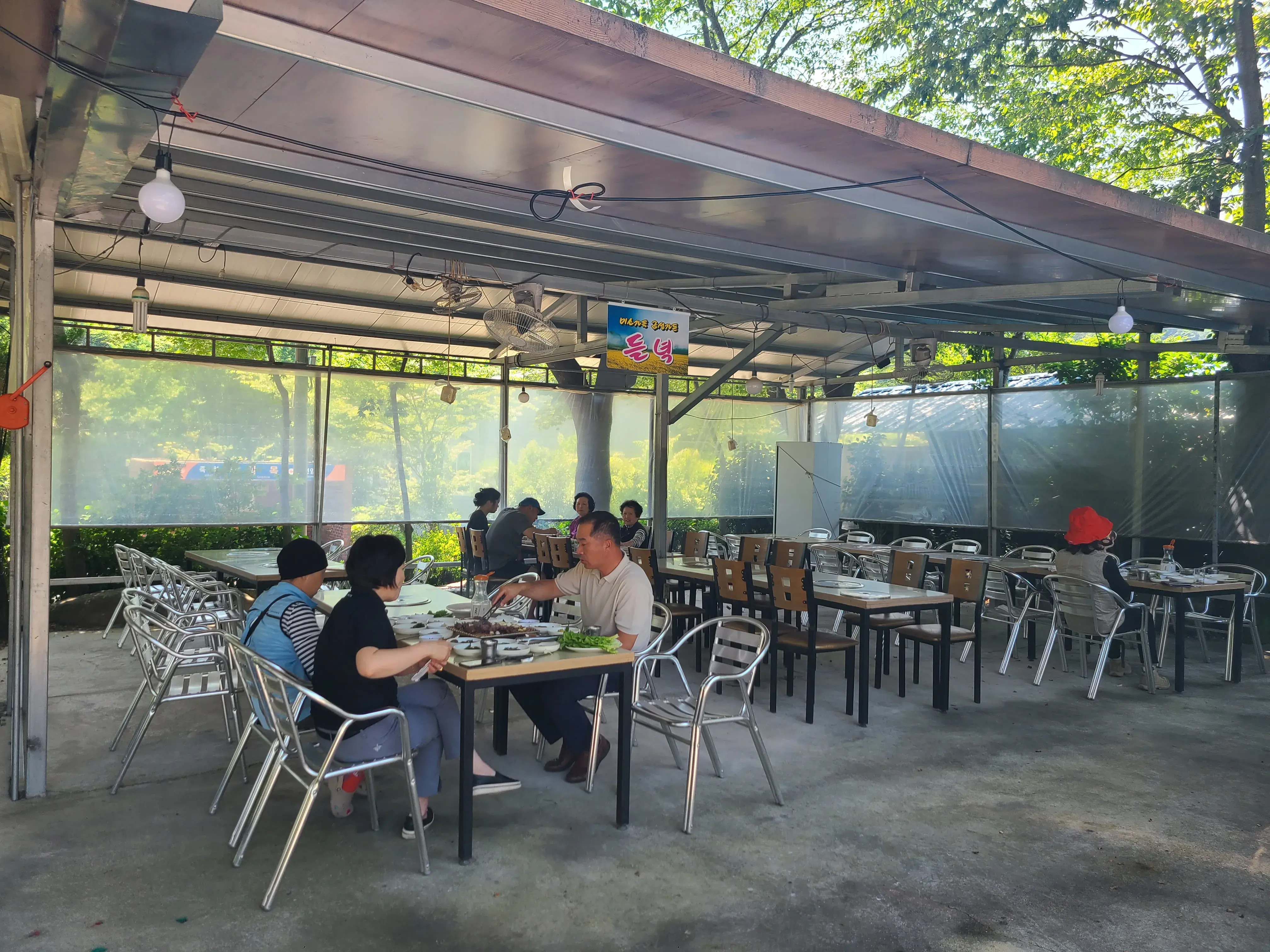 우리도 대세를 따라서 야외에 자리를 잡았다