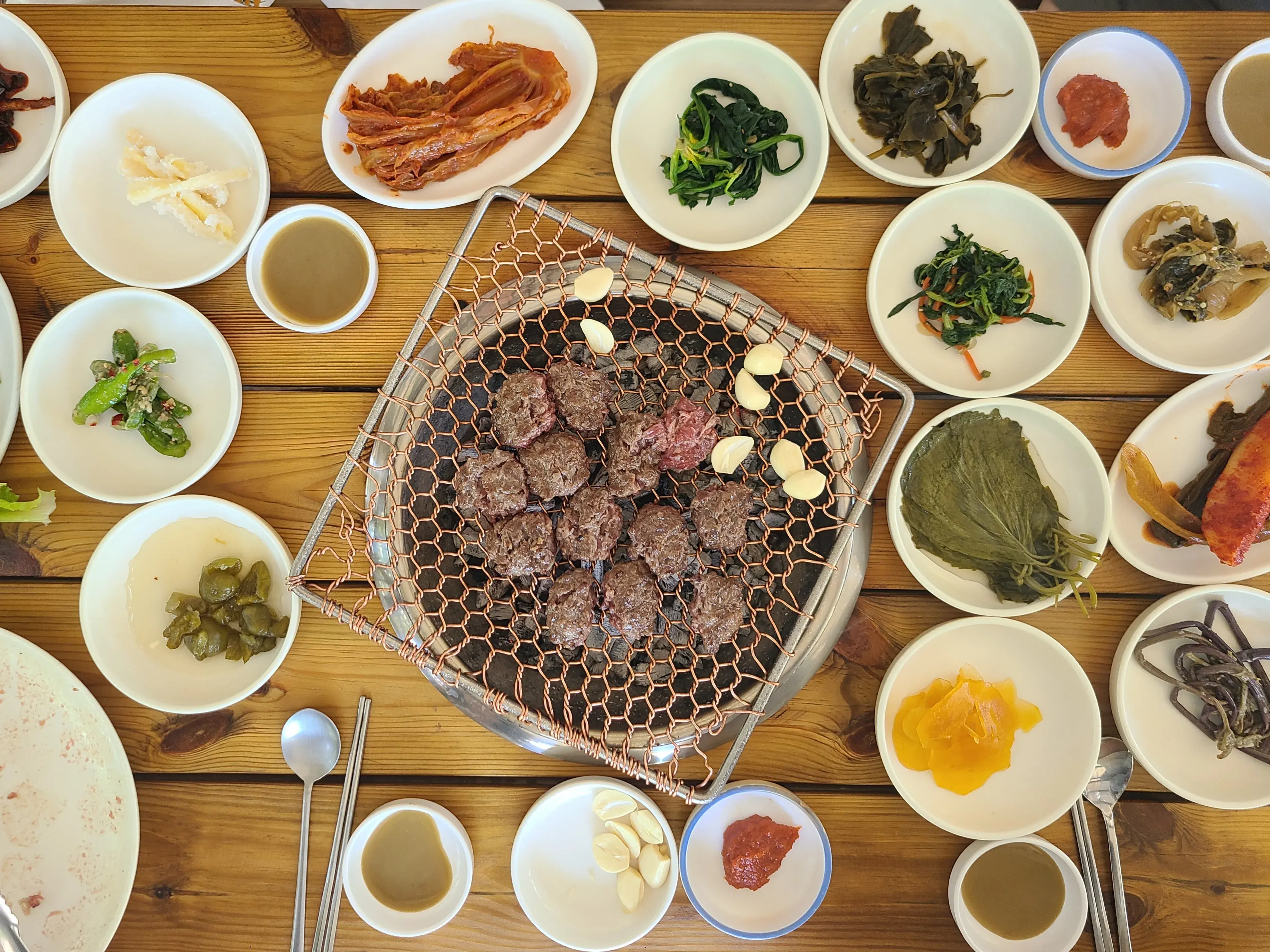 잘 익은 흑염소 떡갈비와 다양한 밑반찬들