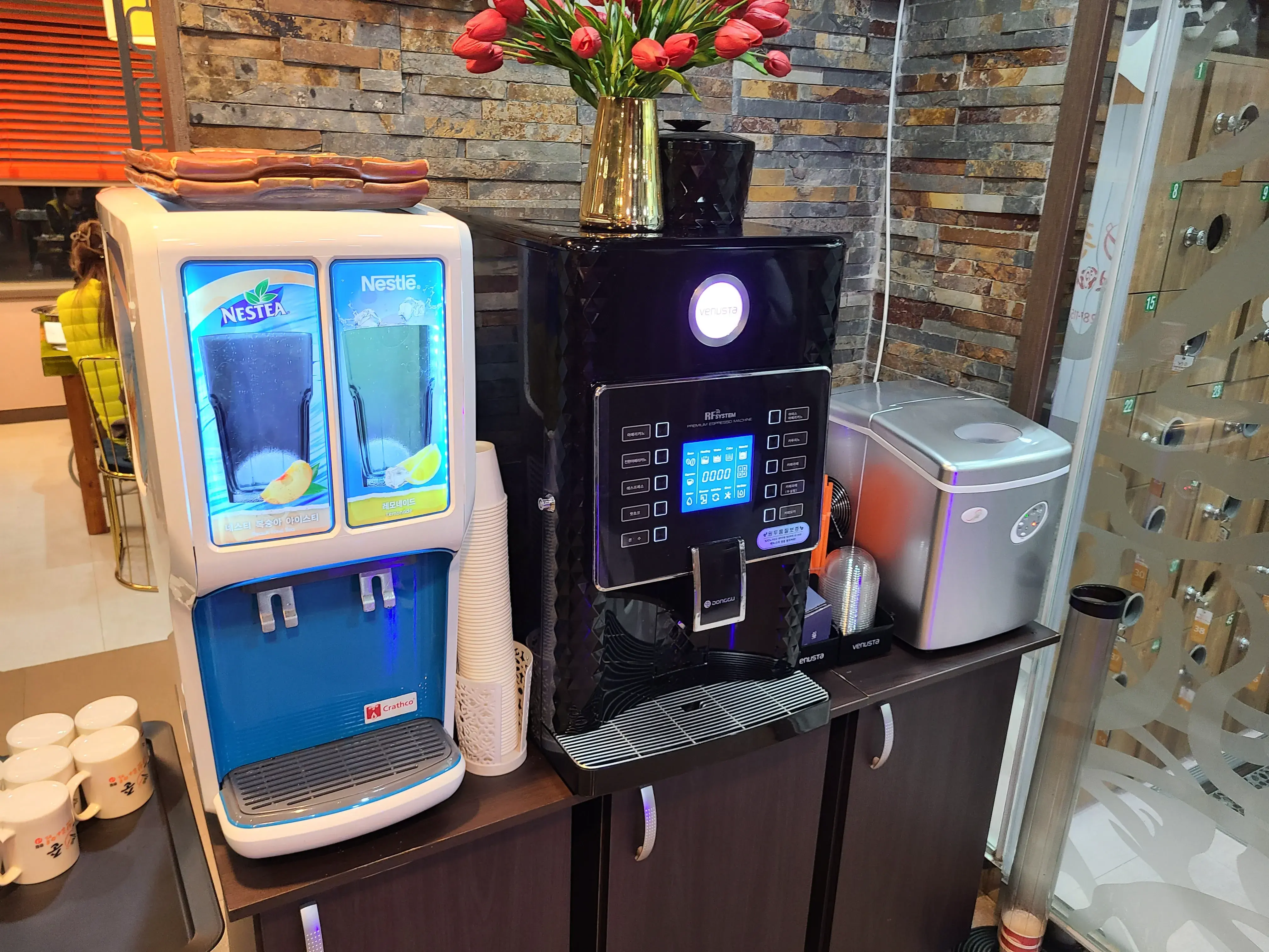 입구 쪽에는 커피머신과 음료 기계도 보인다