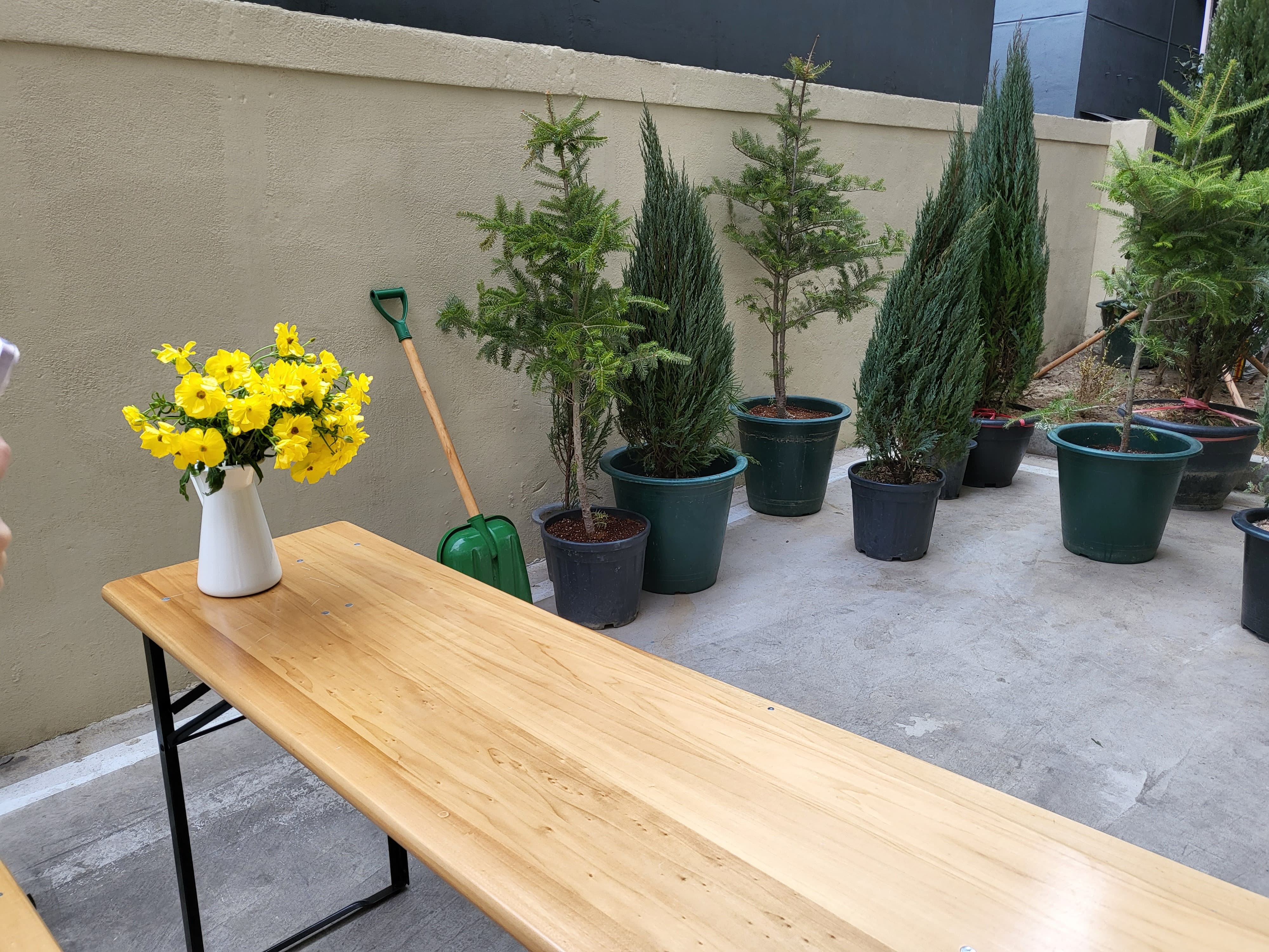 웨이팅을 할 수 있는 의자들과 화분들이 보인다
