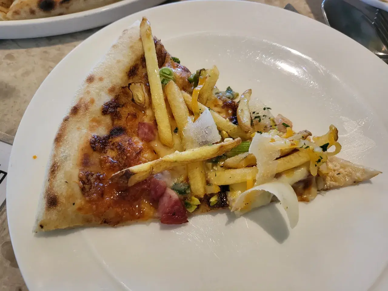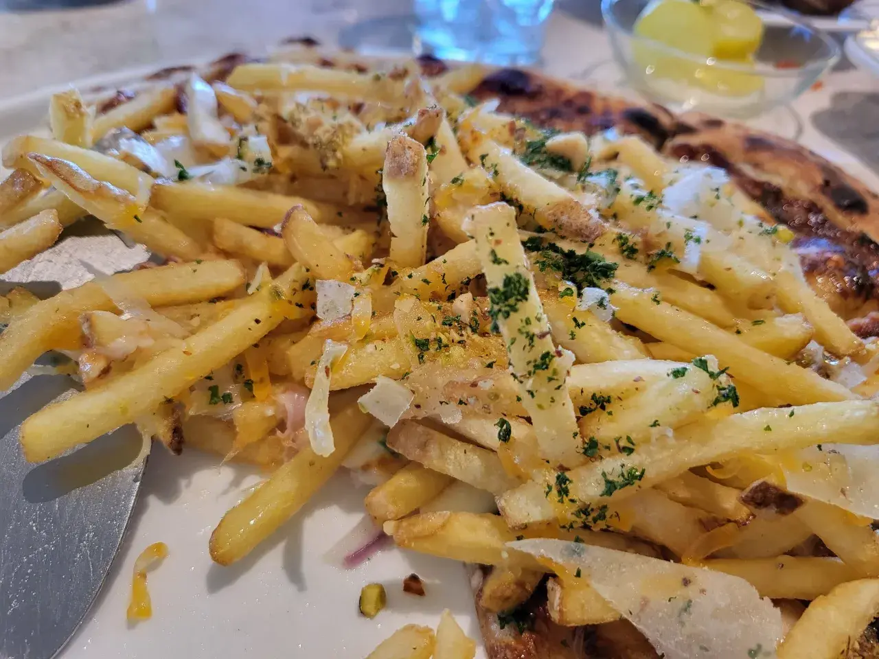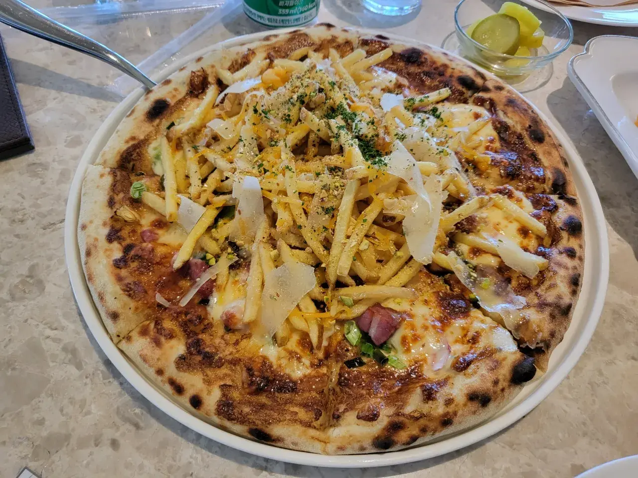 화덕피자위에 토핑으로 감자튀김이 듬뿍
